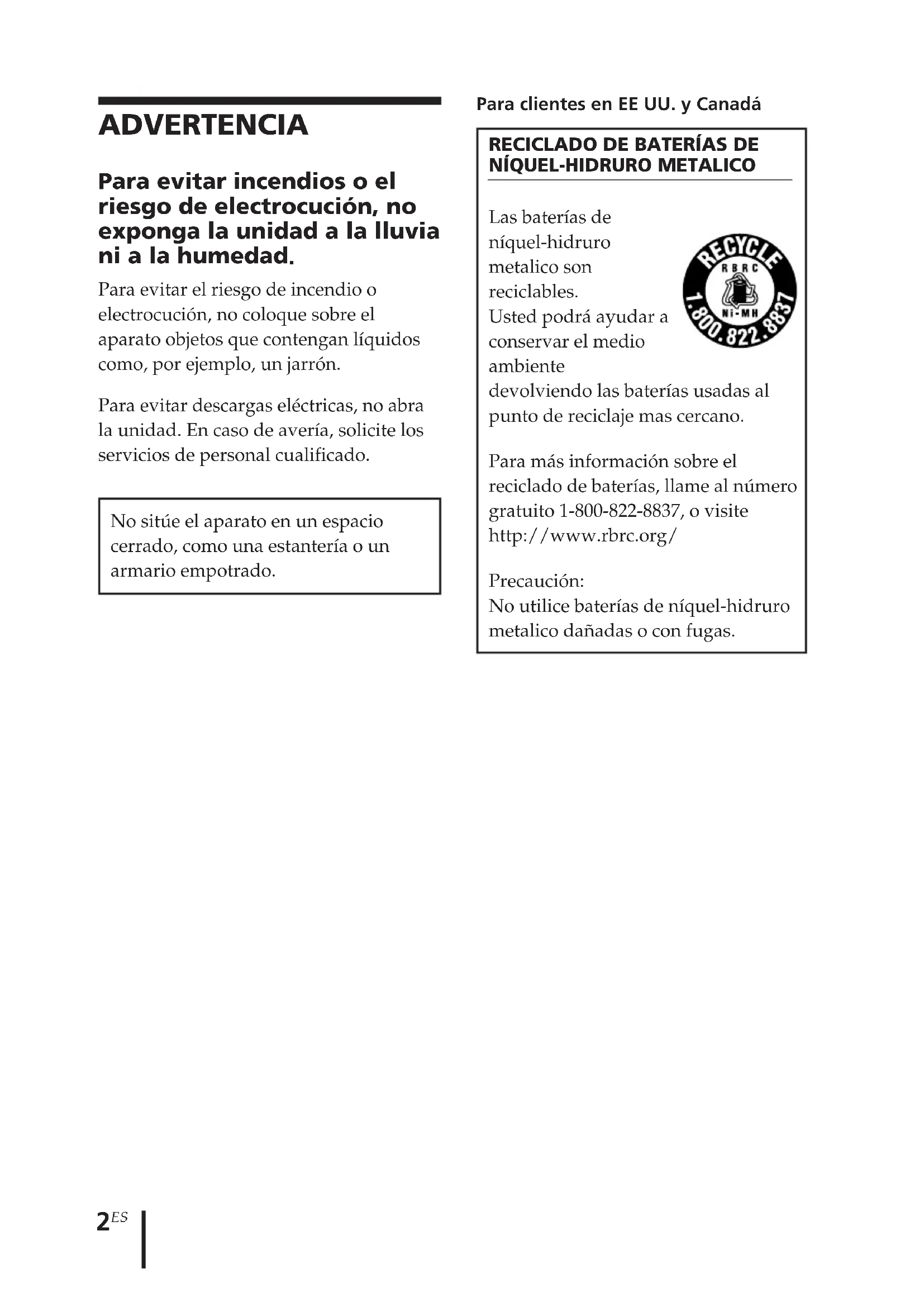 Las baterías de níquel-hidruro metalico son reciclables. Usted podrá ayudar a conservar el medio ambiente devolviendo las baterías usadas al punto de reciclaje mas cercano. Para más información sobre el reciclado de baterías, llame al número gratuito 1-800-822-8837, o visite http://www.rbrc.org/ Precaución: No utilice baterías de níquel-hidruro metalico dañadas o con fugas. ADVERTENCIA Para evitar incendios o el riesgo de electrocución, no exponga la unidad a la lluvia ni a la humedad