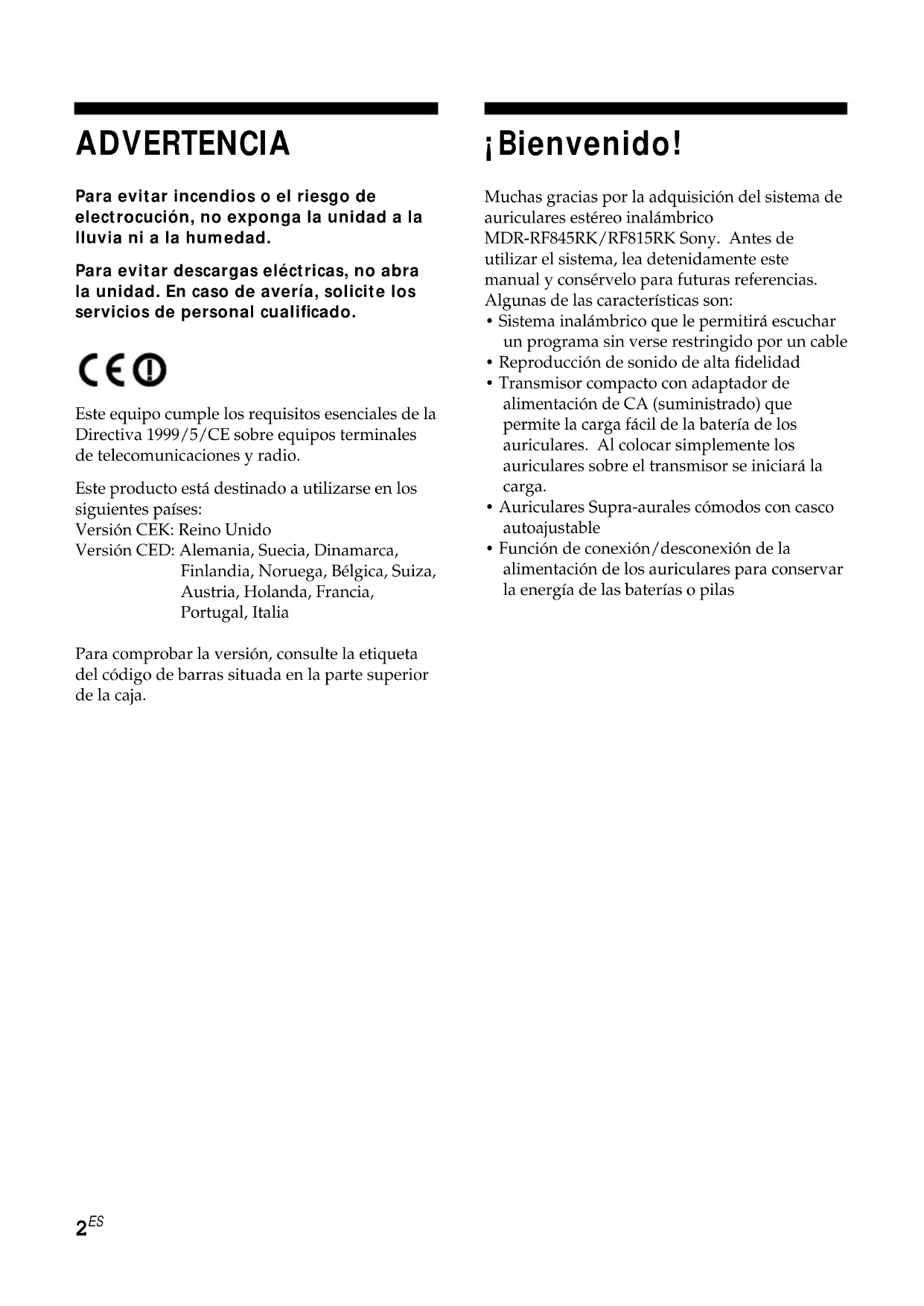 ADVERTENCIA Para evitar incendios o el riesgo de electrocución, no exponga la unidad a la lluvia ni a la humedad. Para evitar descargas eléctricas, no abra la unidad. En caso de avería, solicite los servicios de personal cualificado. Este equipo cumple los requisitos esenciales de la Directiva 1999/5/CE sobre equipos terminales de telecomunicaciones y radio. Este producto está destinado a utilizarse en los siguientes países: Versión CEK: Reino Unido Versión CED: Alemania, Suecia, Dinamarca, Finlandia, Noruega, Bélgica, Suiza, Austria, Holanda, Francia, Portugal, Italia Para comprobar la versión, consulte la etiqueta del código de barras situada en la parte superior de la caja. ¡Bienvenido! Muchas gracias por la adquisición del sistema de auriculares estéreo inalámbrico MDR-RF845RK/RF815RK Sony. Antes de utilizar el sistema, lea detenidamente este manual y consérvelo para futuras referencias. Algunas de las características son: