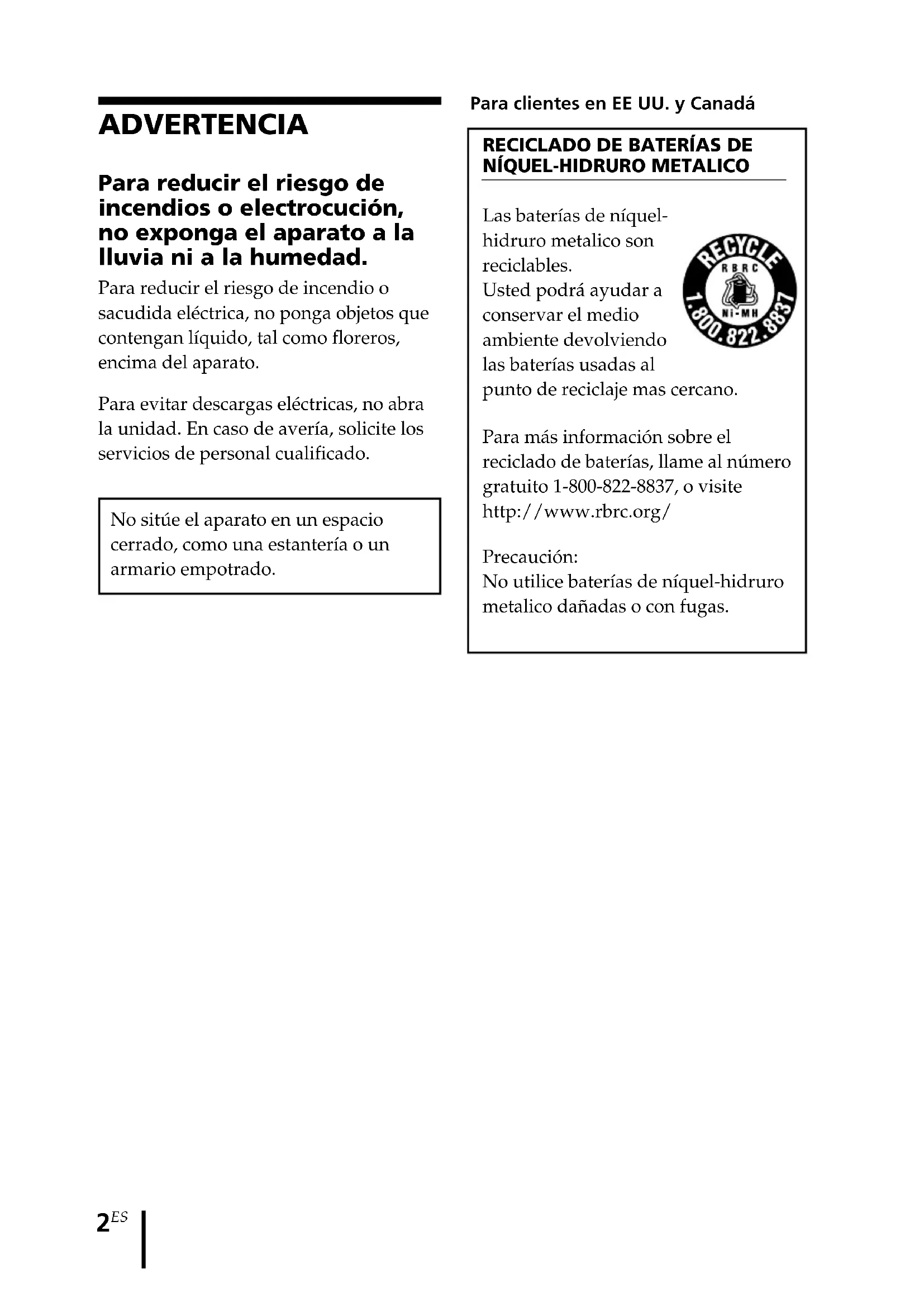 ADVERTENCIA Para reducir el riesgo de incendios o electrocución, no exponga el aparato a la lluvia ni a la humedad. Para reducir el riesgo de incendio o sacudida eléctrica, no ponga objetos que contengan líquido, tal como floreros, encima del aparato. Para evitar descargas eléctricas, no abra la unidad. En caso de avería, solicite los servicios de personal cualificado. No sitúe el aparato en un espacio cerrado, como una estantería o un armario empotrado. Para clientes en EE UU. y Canadá