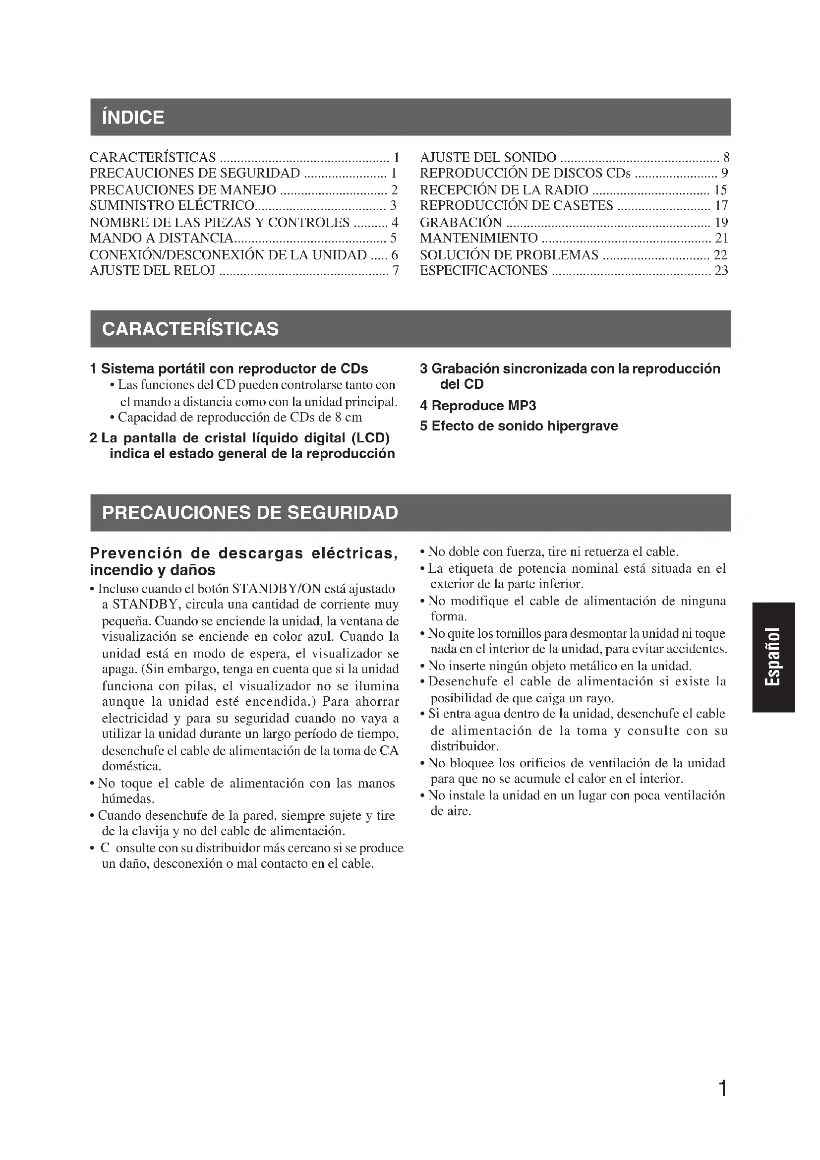 ESPECIFICACIONES .............................................. 23 CARACTERÍSTICAS 1 Sistema portátil con reproductor de CDs