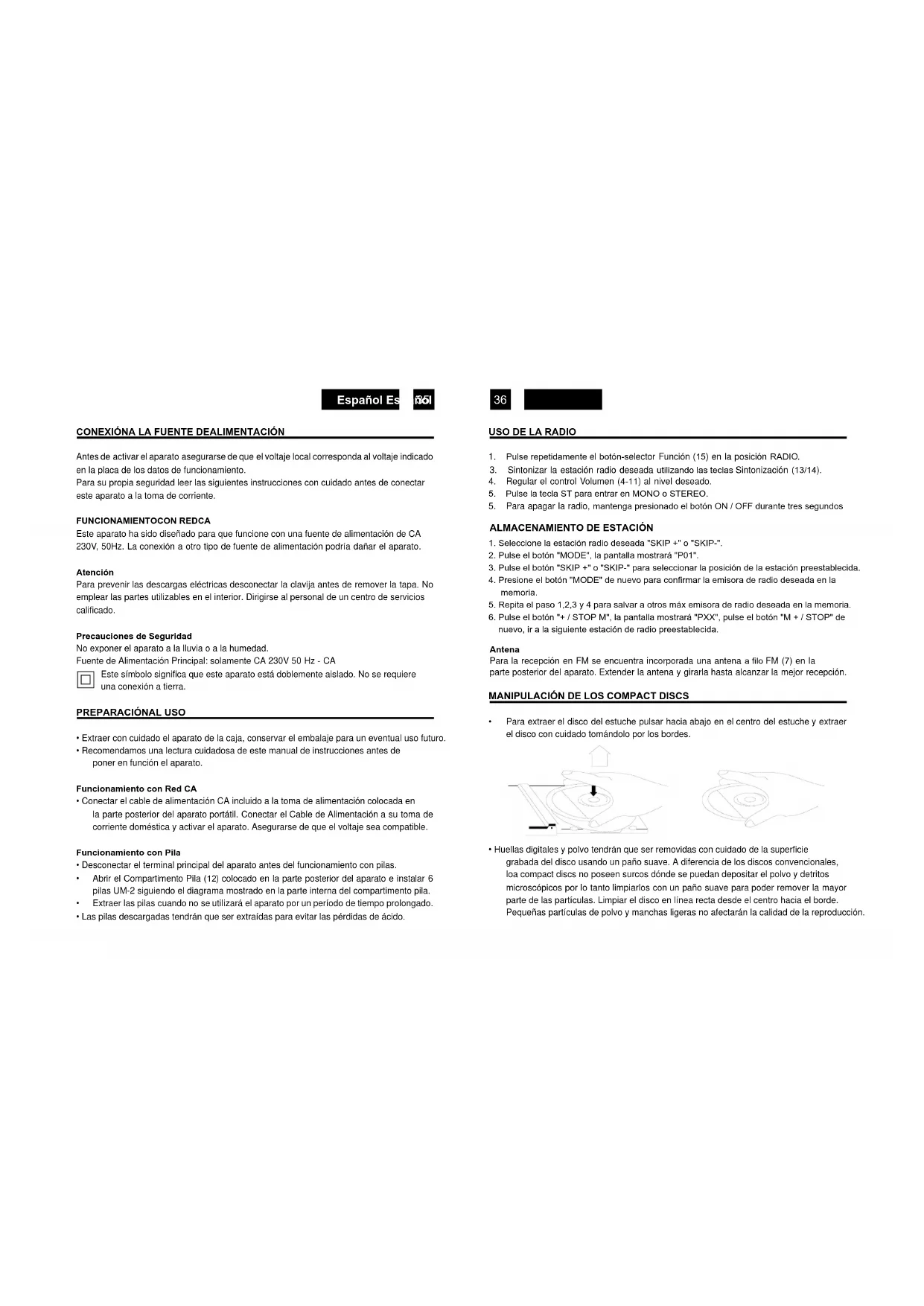 Fuentes Alimentación CA: 230V ~ 50 Hz Baterías: 6 Baterías tipo UM-2 Lector CD Fonocaptor: Rayo Acción 3, Semiconductor Láser Codifica: 16-Bit Lineares Nota: Especificaciones y diseño sujetos a posibles modificaciones sin previo aviso. General Potência: 2 x 1.5 Vatios Consumo: 12,5 W Español 39