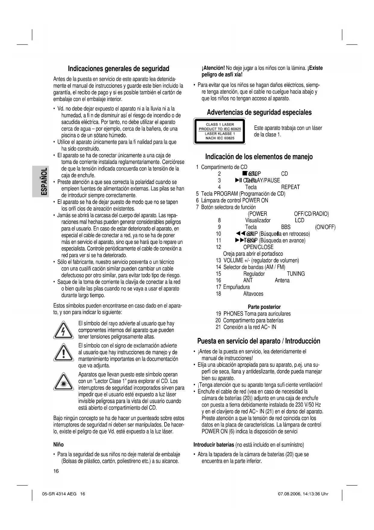 - Las manchas exteriores pueden limpiarse con un paño ligeramente húmedo, sin detergente adicional. Datos técnicos Modelo: .................................................................. SR 4314 CD Suministro de tensión:........................................... 230 V, 50 Hz Consumo de energía:.........................................................14 W Funcionamiento de pila: ................... 6 x 1,5 V, type UM2/LR 14 Potencia de salida:................................................... 60 W PMPO Clase de protección:................................................................ ΙΙ Componente de radio: Gama de frecuencias:................UKW / FM 87,5 ~ 108 MHz .................MW / AM 525 ~ 1615 kHz Este aparato se ha examinado según las normativas actuales y vigentes de la Comunidad Europea, como p.ej. compati- bilidad electromagnética y directiva de baja tensión y se ha construido según las más nuevas especifi caciones en razón de la seguridad. No reservamos el derecho de efectuar modifi caciones técnicas. Garantía Para el aparato comercializado por nosotros nos responsabi- lizamos con una garantía de 24 meses a partir de la fecha de compra (factura de compra). Durante el período de garantía nos encargamos gratuítamente de los defectos del aparato y de los accesorios, que se hayan originado por defectos del material o de la fabricación. Depen- diendo de nuestra estimación se realizará una reparación o un cambio. ¡Los servicios de garantía no prolangan la garantía, ni se incia por ello un período nuevo de garantía! Como comprobante para la garantía es válido la factura de compra. Sin este comprobante no se podrá realizar un cambio o una reparación gratuíta. En caso de garantía entregue el aparato completo en su emba- laje original junto con la factura a su agente comerciante. Defectos en los accesorios de uso o en las piezas de desgaste, como también la limpieza, mantenimiento o el recambio de piezas de desgaste no recaen en la garantía e irán al cargo del cliente! En caso de intervención ajena se expira la garantía. Después de la garantía Después de haber expirado la garantía se pueden realizar las reparaciones por el concesionario o por el servicio de reparacio- nes. Los gastos irán al cargo del cliente. 05-SR 4314 AEG 18 07.08.2006, 14:13:41 UhrESPAÑOL