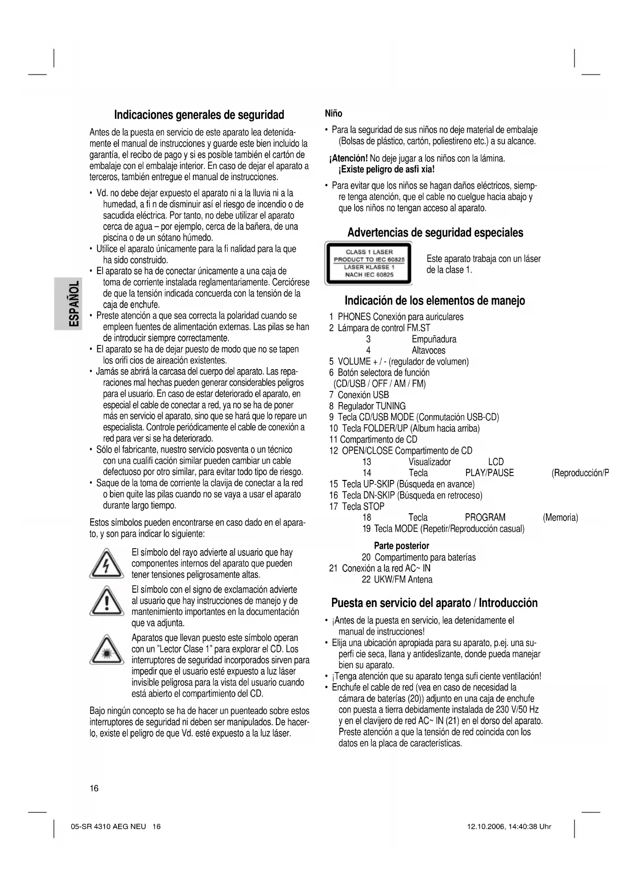 - Para evitar que los niños se hagan daños eléctricos, siemp- re tenga atención, que el cable no cuelgue hacia abajo y que los niños no tengan acceso al aparato. Advertencias de seguridad especiales Este aparato trabaja con un láser de la clase 1. Indicación de los elementos de manejo 1 PHONES Conexión para auriculares 2 Lámpara de control FM.ST 3 Empuñadura 4 Altavoces 5 VOLUME + / - (regulador de volumen) 6 Botón selectora de función (CD/USB / OFF / AM / FM) 7 Conexión USB 8 Regulador TUNING 9 Tecla CD/USB MODE (Conmutación USB-CD) 10 Tecla FOLDER/UP (Album hacia arriba) 11 Compartimento de CD 12 OPEN/CLOSE Compartimento de CD 13 Visualizador LCD 14 Tecla PLAY/PAUSE (Reproducción/Pausa) 15 Tecla UP-SKIP (Búsqueda en avance) 16 Tecla DN-SKIP (Búsqueda en retroceso) 17 Tecla STOP 18 Tecla PROGRAM (Memoria) 19 Tecla MODE (Repetir/Reproducción casual) Parte posterior 20 Compartimento para baterías 21 Conexión a la red AC~ IN 22 UKW/FM Antena Puesta en servicio del aparato / Introducción