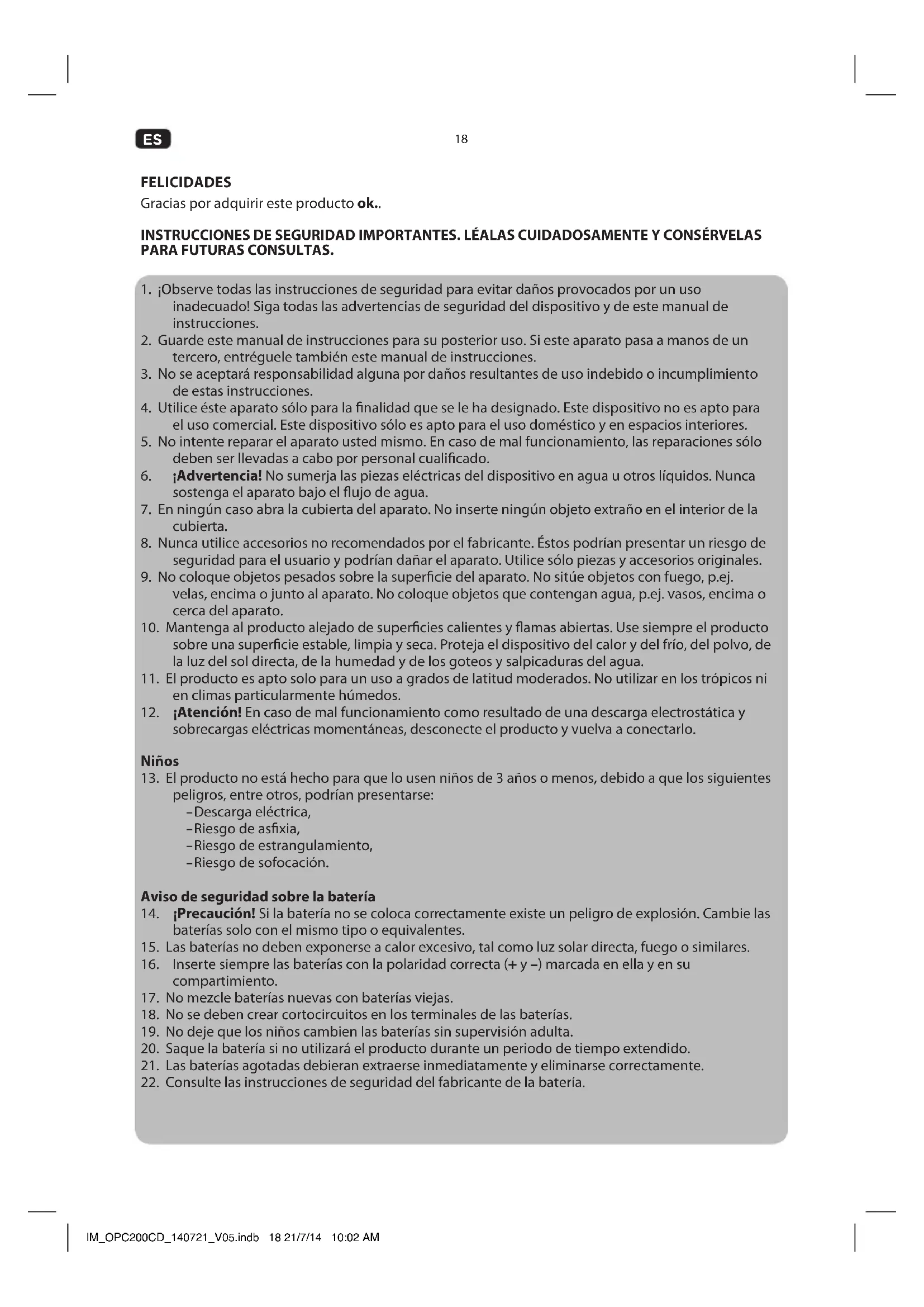 La imagen del contenedor de basura tachado, indica la recogida selectiva de residuos eléctricos y electrónicos (RAEE). El material eléctrico y electrónico puede contener sustancias peligrosas. No coloque este aparato como residuo junto a la basura doméstica. Devuélvalo a un punto de recogida designado para el reciclaje de RAEE. De este modo, ayudará a conservar recursos y a proteger el medio ambiente. Para más información, póngase en contacto con su distribuidor o sus autoridades locales. IM_OPC200CD_140721_V05.indb 22 21/7/14 10:02 AM23