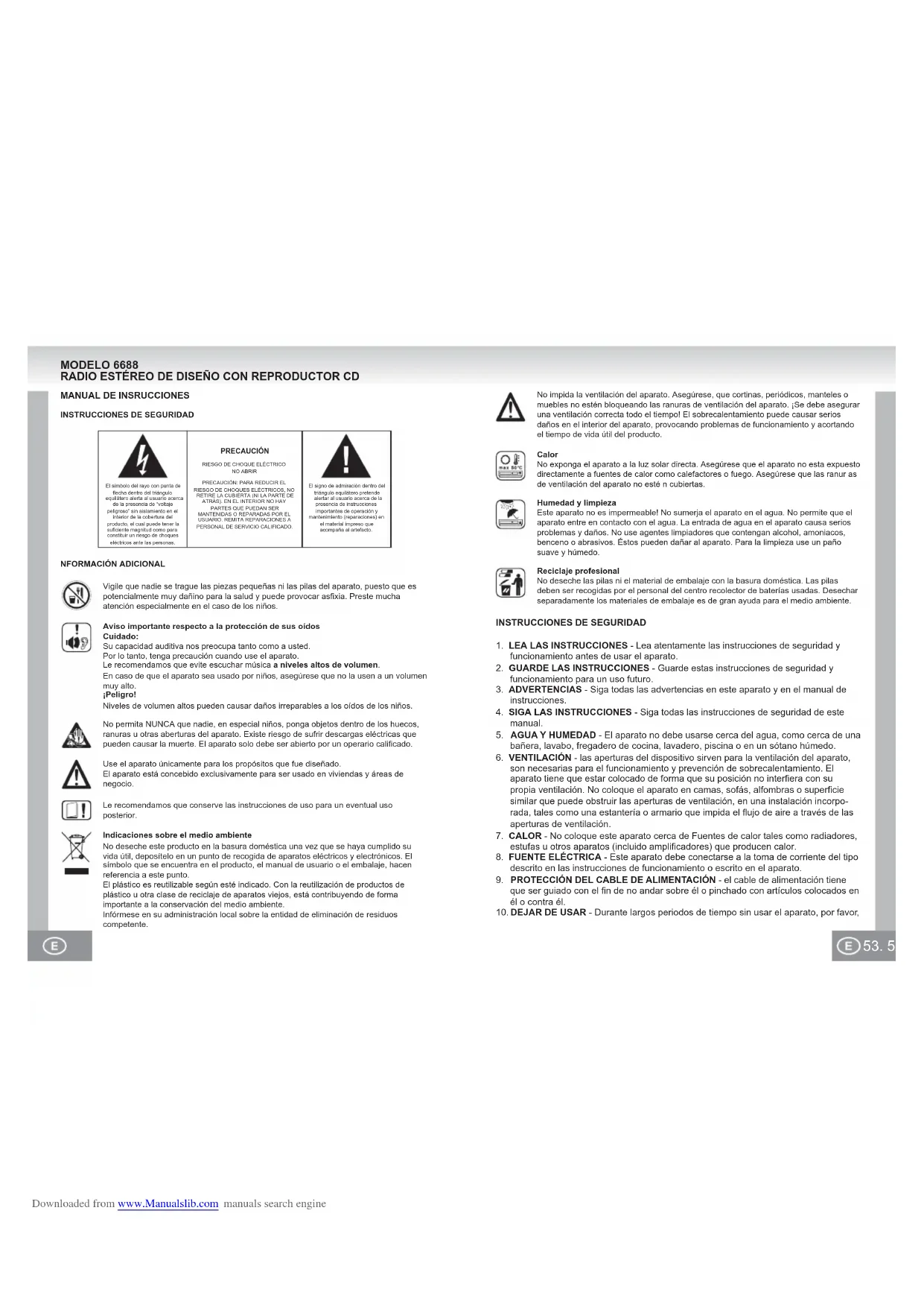 Il CD salta Display Segnale debole. Interferenze di altri dispositivi (TV, VCR, computer, ecc.). CD sporco o danneggiato. Nessun CD inserito. Il CD è sporco o danneggiato. Condensa sulla lente del laser. CD-R / RW è vuoto o non finalizzato. Regolare l’antenna: FM: Antenna telescopica. AM: Regolare l’unità. Tenere una certa distanza da altri dispositivi. Sostituire o pulire il disco. Inserire un CD, CD-R o CD-RW. Sostituire o pulire il CD. Attendere che la lente del laser sia completamente asciutta (ca. 1 ora). Finalizzare il CD-R / RW. Downloaded from www.Manualslib.com manuals search engine53. 52. El símbolo del rayo con punta de flecha dentro del triángulo equilátero alerta al usuario acerca de la presencia de “voltaje peligroso” sin aislamiento en el interior de la cobertura del producto, el cual puede tener la suficiente magnitud como para constituir un riesgo de choques eléctricos ante las personas.El signo de admiración dentro del triángulo equilátero pretende alertar al usuario acerca de la presencia de instrucciones importantes de operación y mantenimiento (reparaciones) en el material impreso que acompaña al artefacto.PRECAUCIÓNRIESGO DE CHOQUE ELÉCTRICONO ABRIRPRECAUCIÓN: PARA REDUCIR EL RIESGO DE CHOQUES ELÉCTRICOS, NO RETIRE LA CUBIERTA (NI LA PARTE DE ATRÁS). EN EL INTERIOR NO HAY PARTES QUE PUEDAN SER MANTENIDAS O REPARADAS POR EL USUARIO. REMITA REPARACIONES A PERSONAL DE SERVICIO CALIFICADO. MODELO 6688 RADIO ESTÉREO DE DISEÑO CON REPRODUCTOR CD Indicaciones sobre el medio ambienteNo deseche este producto en la basura doméstica una vez que se haya cumplido su vida útil, deposítelo en un punto de recogida de aparatos eléctricos y electrónicos. El símbolo que se encuentra en el producto, el manual de usuario o el embalaje, hacen referencia a este punto.El plástico es reutilizable según esté indicado. Con la reutilización de productos de plástico u otra clase de reciclaje de aparatos viejos, está contribuyendo de forma importante a la conservación del medio ambiente.Infórmese en su administración local sobre la entidad de eliminación de residuos competente.Le recomendamos que conserve las instrucciones de uso para un eventual uso posterior.No permita NUNCA que nadie, en especial niños, ponga objetos dentro de los huecos, ranuras u otras aberturas del aparato. Existe riesgo de sufrir descargas eléctricas que pueden causar la muerte. El aparato solo debe ser abierto por un operario calificado.Vigile que nadie se trague las piezas pequeñas ni las pilas del aparato, puesto que es potencialmente muy dañino para la salud y puede provocar asfixia. Preste mucha atención especialmente en el caso de los niños.Aviso importante respecto a la protección de sus oídosCuidado:Su capacidad auditiva nos preocupa tanto como a usted.Por lo tanto, tenga precaución cuando use el aparato.Le recomendamos que evite escuchar música a niveles altos de volumen.En caso de que el aparato sea usado por niños, asegúrese que no la usen a un volumen muy alto.¡Peligro!Niveles de volumen altos pueden causar daños irreparables a los oídos de los niños.Use el aparato únicamente para los propósitos que fue diseñado.El aparato está concebido exclusivamente para ser usado en viviendas y áreas de negocio.NFORMACIÓN ADICIONALMANUAL DE INSRUCCIONESINSTRUCCIONES DE SEGURIDADINSTRUCCIONES DE SEGURIDAD1. LEA LAS INSTRUCCIONES - Lea atentamente las instrucciones de seguridad y funcionamiento antes de usar el aparato.2. GUARDE LAS INSTRUCCIONES - Guarde estas instrucciones de seguridad y funcionamiento para un uso futuro.3. ADVERTENCIAS - Siga todas las advertencias en este aparato y en el manual de instrucciones.4. SIGA LAS INSTRUCCIONES - Siga todas las instrucciones de seguridad de este manual.