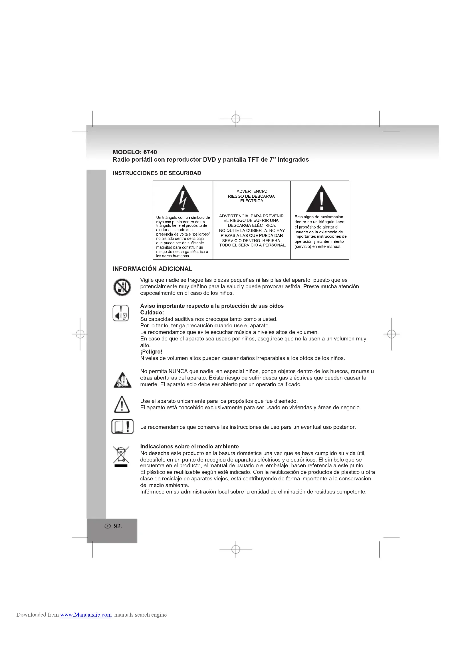 Downloaded from www.Manualslib.com manuals search engine92. MODELO: 6740 Radio portátil con reproductor DVD y pantalla TFT de 7” integrados INSTRUCCIONES DE SEGURIDADADVERTENCIA:RIESGO DE DESCARGA ELÉCTRICAADVERTENCIA: PARA PREVENIR EL RIESGO DE SUFRIR UNA DESCARGA ELÉCTRICA, NO QUITE LA CUBIERTA. NO HAY PIEZAS A LAS QUE PUEDA DAR SERVICIO DENTRO. REFIERA TODO EL SERVICIO A PERSONAL.Este signo de exclamación dentro de un triángulo tiene el propósito de alertar al usuario de la existencia de importantes instrucciones de operación y mantenimiento (servicio) en este manual.Un triángulo con un símbolo de rayo con punta dentro de un triángulo tiene el propósito de alertar al usuario de la presencia de voltaje “peligroso” no aislado dentro de la caja que puede ser de suficiente magnitud para constituir un riesgo de descarga eléctrica a los seres humanos.Vigile que nadie se trague las piezas pequeñas ni las pilas del aparato, puesto que es potencialmente muy dañino para la salud y puede provocar asfixia. Preste mucha atención especialmente en el caso de los niños.Aviso importante respecto a la protección de sus oídosCuidado:Su capacidad auditiva nos preocupa tanto como a usted.Por lo tanto, tenga precaución cuando use el aparato.Le recomendamos que evite escuchar música a niveles altos de volumen.En caso de que el aparato sea usado por niños, asegúrese que no la usen a un volumen muy alto.¡Peligro!Niveles de volumen altos pueden causar daños irreparables a los oídos de los niños.No permita NUNCA que nadie, en especial niños, ponga objetos dentro de los huecos, ranuras u otras aberturas del aparato. Existe riesgo de sufrir descargas eléctricas que pueden causar la muerte. El aparato solo debe ser abierto por un operario calificado.Use el aparato únicamente para los propósitos que fue diseñado.El aparato está concebido exclusivamente para ser usado en viviendas y áreas de negocio.Le recomendamos que conserve las instrucciones de uso para un eventual uso posterior.Indicaciones sobre el medio ambienteNo deseche este producto en la basura doméstica una vez que se haya cumplido su vida útil, deposítelo en un punto de recogida de aparatos eléctricos y electrónicos. El símbolo que se encuentra en el producto, el manual de usuario o el embalaje, hacen referencia a este punto.El plástico es reutilizable según esté indicado. Con la reutilización de productos de plástico u otra clase de reciclaje de aparatos viejos, está contribuyendo de forma importante a la conservación del medio ambiente.Infórmese en su administración local sobre la entidad de eliminación de residuos competente.