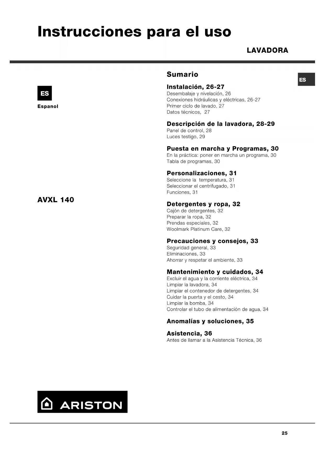 LAVADORA AVXL 140 Instrucciones para el uso26