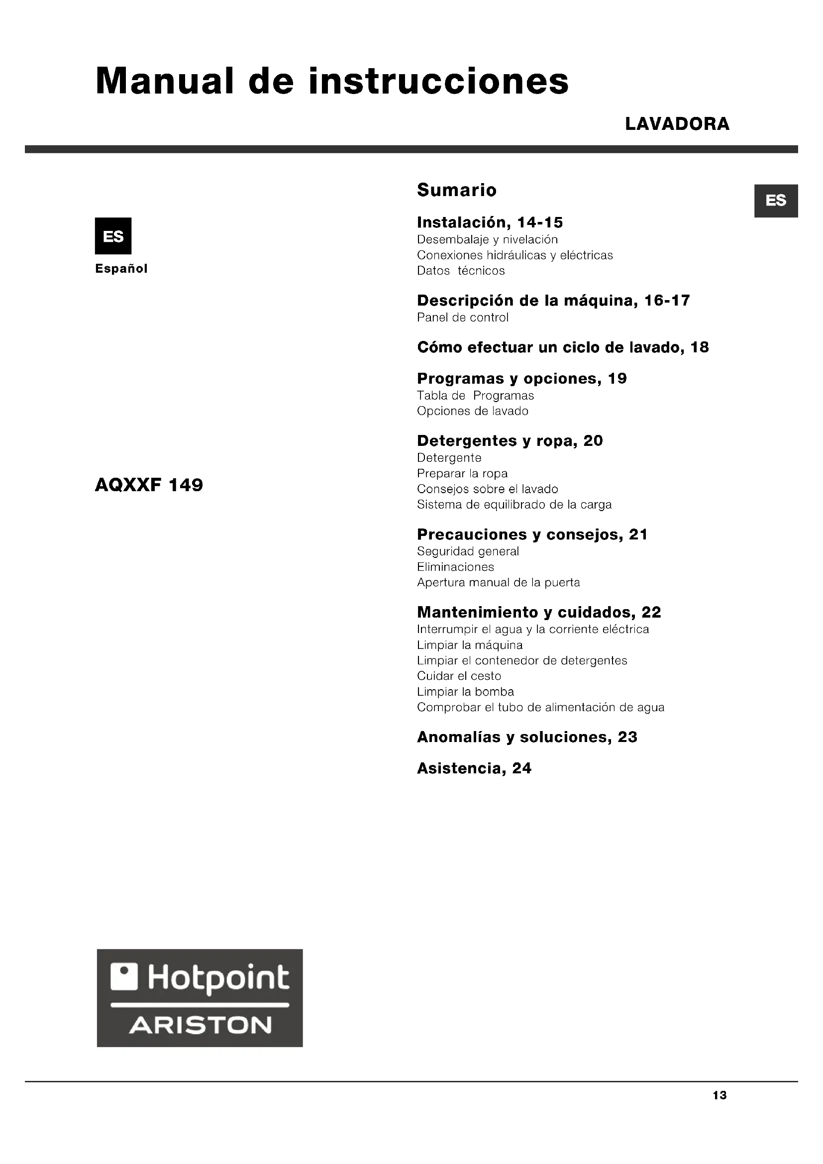 Descarga las instrucciones para tu Lavadora en formato PDF gratis! Encuentra tus instrucciones AQXXF 149 - HOTPOINT ARISTON y toma tu dispositivo electrónico nuevamente en la mano. En esta página están publicados todos los documentos necesarios para el uso de su dispositivo. AQXXF 149 de la marca HOTPOINT ARISTON.