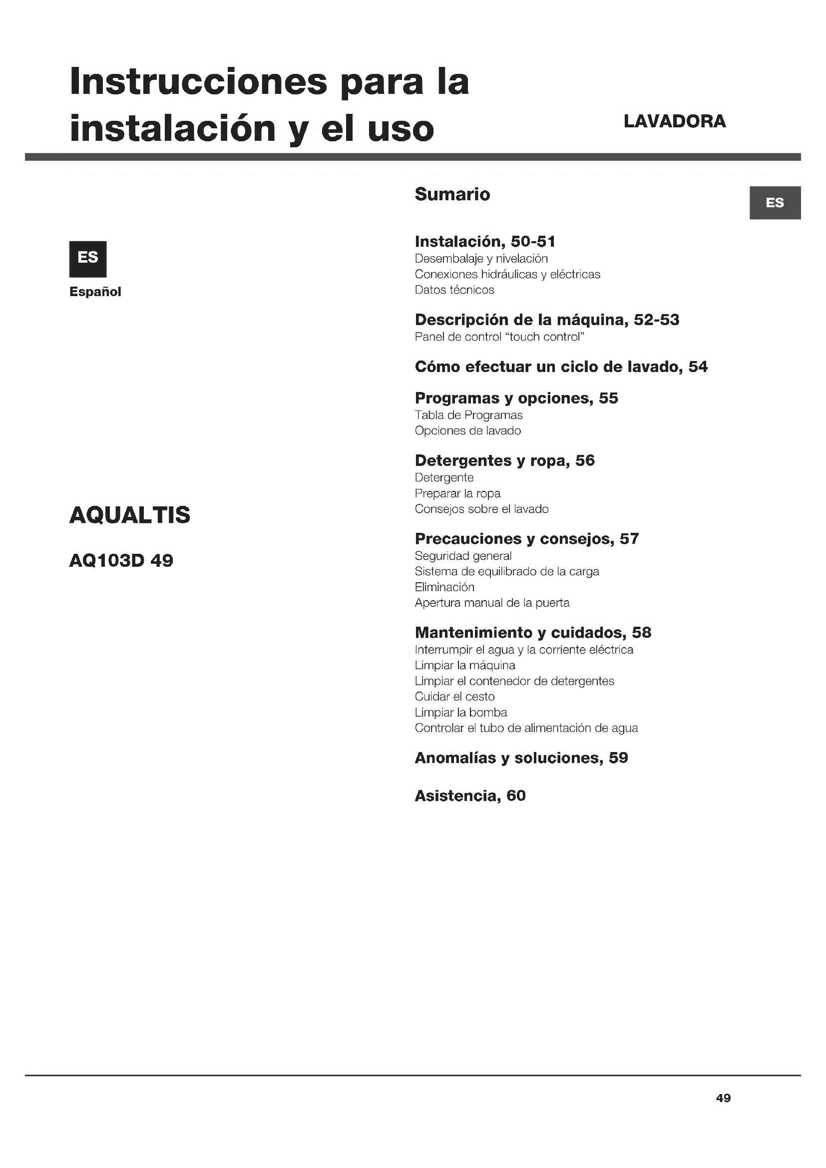 Español Sumario Instalación, 50-51 Desembalaje y nivelaciónConexiones hidráulicas y eléctricasDatos técnicos Descripción de la máquina, 52-53 Panel de control “touch control” Cómo efectuar un ciclo de lavado, 54 Programas y opciones, 55 Tabla de ProgramasOpciones de lavado Detergentes y ropa, 56 DetergentePreparar la ropaConsejos sobre el lavado Precauciones y consejos, 57 Seguridad general Sistema de equilibrado de la cargaEliminaciónApertura manual de la puerta Mantenimiento y cuidados, 58 Interrumpir el agua y la corriente eléctricaLimpiar la máquinaLimpiar el contenedor de detergentesCuidar el cestoLimpiar la bombaControlar el tubo de alimentación de agua Anomalías y soluciones, 59 Asistencia, 60