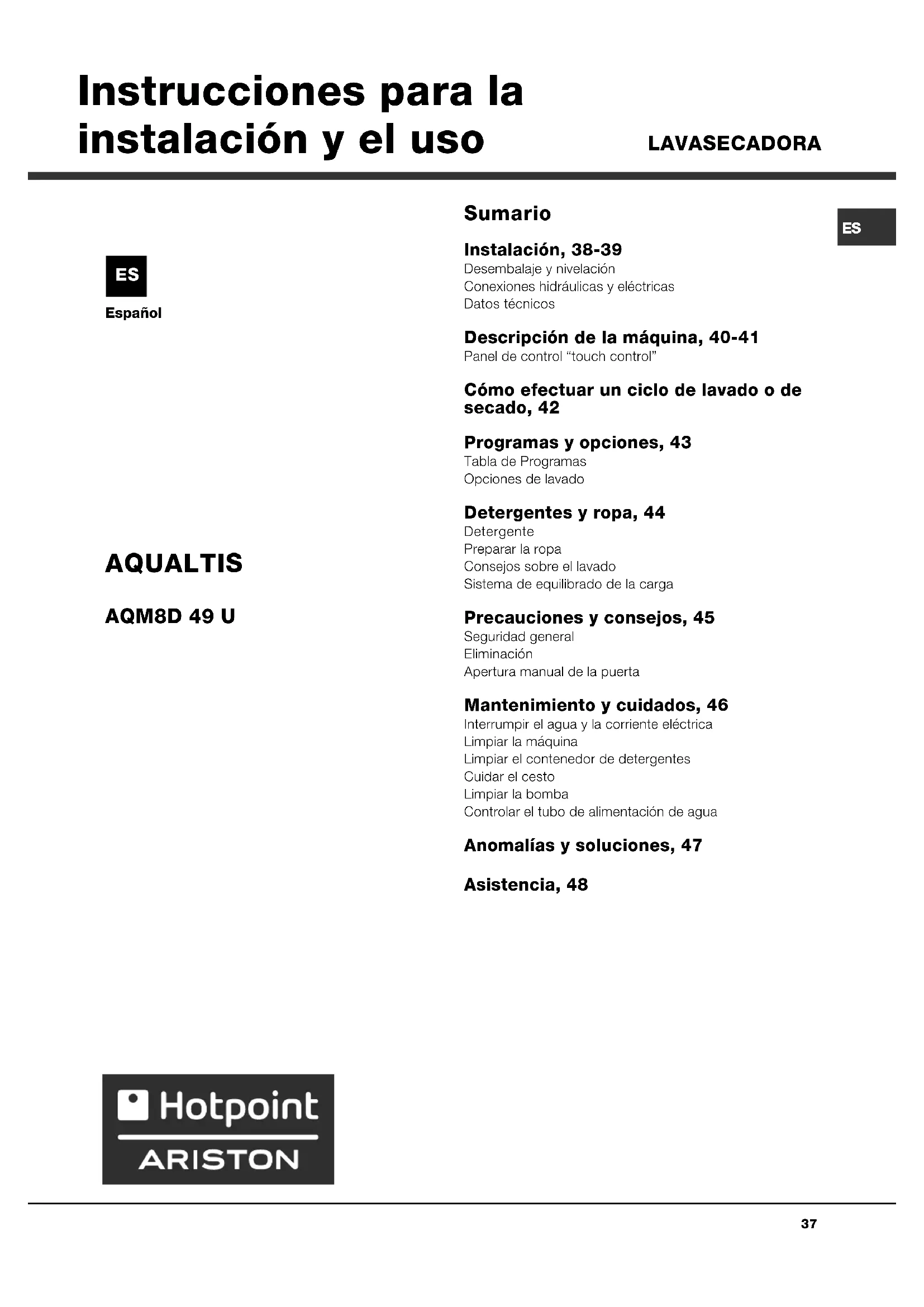 Español Sumario Instalación, 38-39 Desembalaje y nivelaciónConexiones hidráulicas y eléctricasDatos técnicos Descripción de la máquina, 40-41 Panel de control touch control Cómo efectuar un ciclo de lavado o de secado, 42 Programas y opciones, 43 Tabla de ProgramasOpciones de lavado Detergentes y ropa, 44 DetergentePreparar la ropaConsejos sobre el lavadoSistema de equilibrado de la carga Precauciones y consejos, 45 Seguridad generalEliminaciónApertura manual de la puerta Mantenimiento y cuidados, 46 Interrumpir el agua y la corriente eléctricaLimpiar la máquinaLimpiar el contenedor de detergentesCuidar el cestoLimpiar la bombaControlar el tubo de alimentación de agua Anomalías y soluciones, 47 Asistencia, 48
