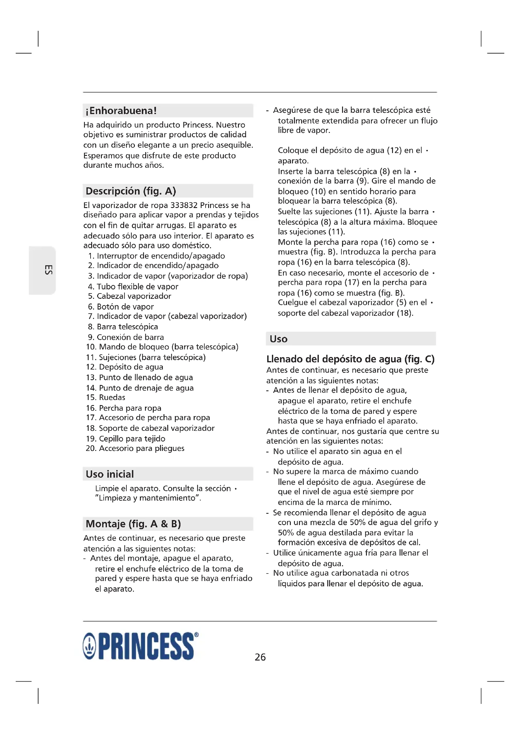 ¡Enhorabuena! Ha adquirido un producto Princess. Nuestro objetivo es suministrar productos de calidad con un diseño elegante a un precio asequible. Esperamos que disfrute de este producto durante muchos años. Descripción (fig. A) El vaporizador de ropa 333832 Princess se ha diseñado para aplicar vapor a prendas y tejidos con el fin de quitar arrugas. El aparato es adecuado sólo para uso interior. El aparato es adecuado sólo para uso doméstico.
