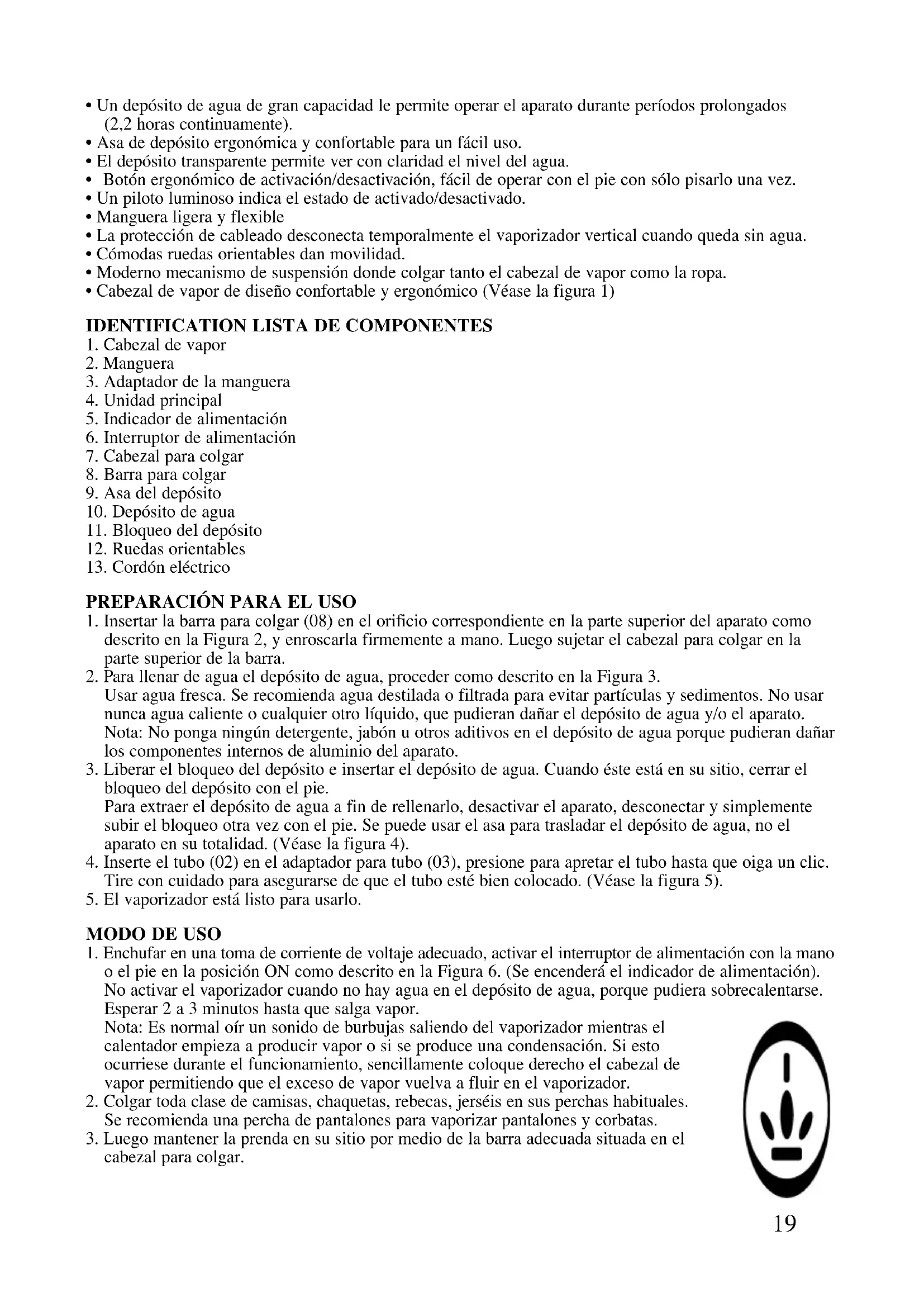 o el pie en la posición ON como descrito en la Figura 6. (Se encenderá el indicador de alimentación). No activar el vaporizador cuando no hay agua en el depósito de agua, porque pudiera sobrecalentarse. Esperar 2 a 3 minutos hasta que salga vapor. Nota: Es normal oír un sonido de burbujas saliendo del vaporizador mientras el calentador empieza a producir vapor o si se produce una condensación. Si esto ocurriese durante el funcionamiento, sencillamente coloque derecho el cabezal de vapor permitiendo que el exceso de vapor vuelva a fluir en el vaporizador.