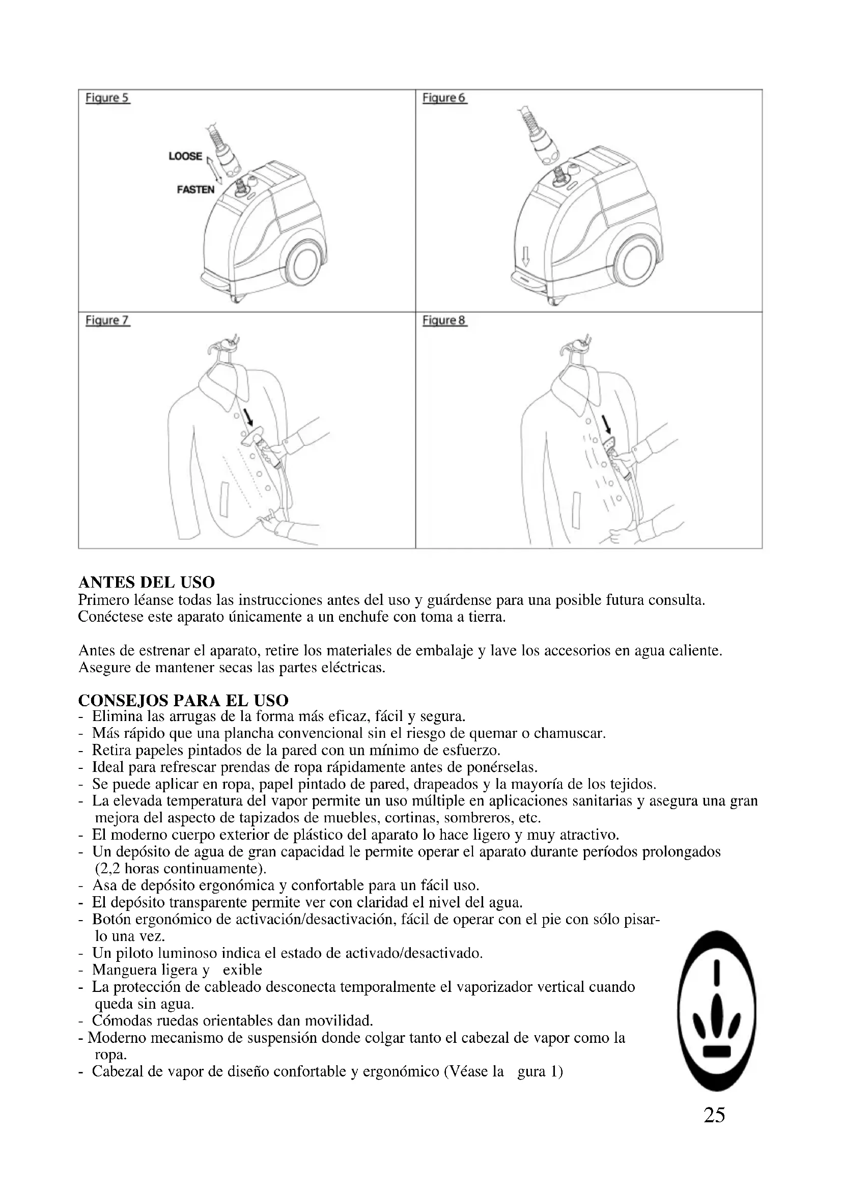 - Elimina las arrugas de la forma más eficaz, fácil y segura. - Más rápido que una plancha convencional sin el riesgo de quemar o chamuscar. - Retira papeles pintados de la pared con un mínimo de esfuerzo. - Ideal para refrescar prendas de ropa rápidamente antes de ponérselas. - Se puede aplicar en ropa, papel pintado de pared, drapeados y la mayoría de los tejidos. - La elevada temperatura del vapor permite un uso múltiple en aplicaciones sanitarias y asegura una gran mejora del aspecto de tapizados de muebles, cortinas, sombreros, etc. - El moderno cuerpo exterior de plástico del aparato lo hace ligero y muy atractivo. - Un depósito de agua de gran capacidad le permite operar el aparato durante períodos prolongados (2,2 horas continuamente). - Asa de depósito ergonómica y confortable para un fácil uso. - El depósito transparente permite ver con claridad el nivel del agua. - Botón ergonómico de activación/desactivación, fácil de operar con el pie con sólo pisar- lo una vez. - Un piloto luminoso indica el estado de activado/desactivado. - Manguera ligera y flexible - La protección de cableado desconecta temporalmente el vaporizador vertical cuando queda sin agua. - Cómodas ruedas orientables dan movilidad. - Moderno mecanismo de suspensión donde colgar tanto el cabezal de vapor como la ropa. - Cabezal de vapor de diseño confortable y ergonómico (Véase la figura 1)26