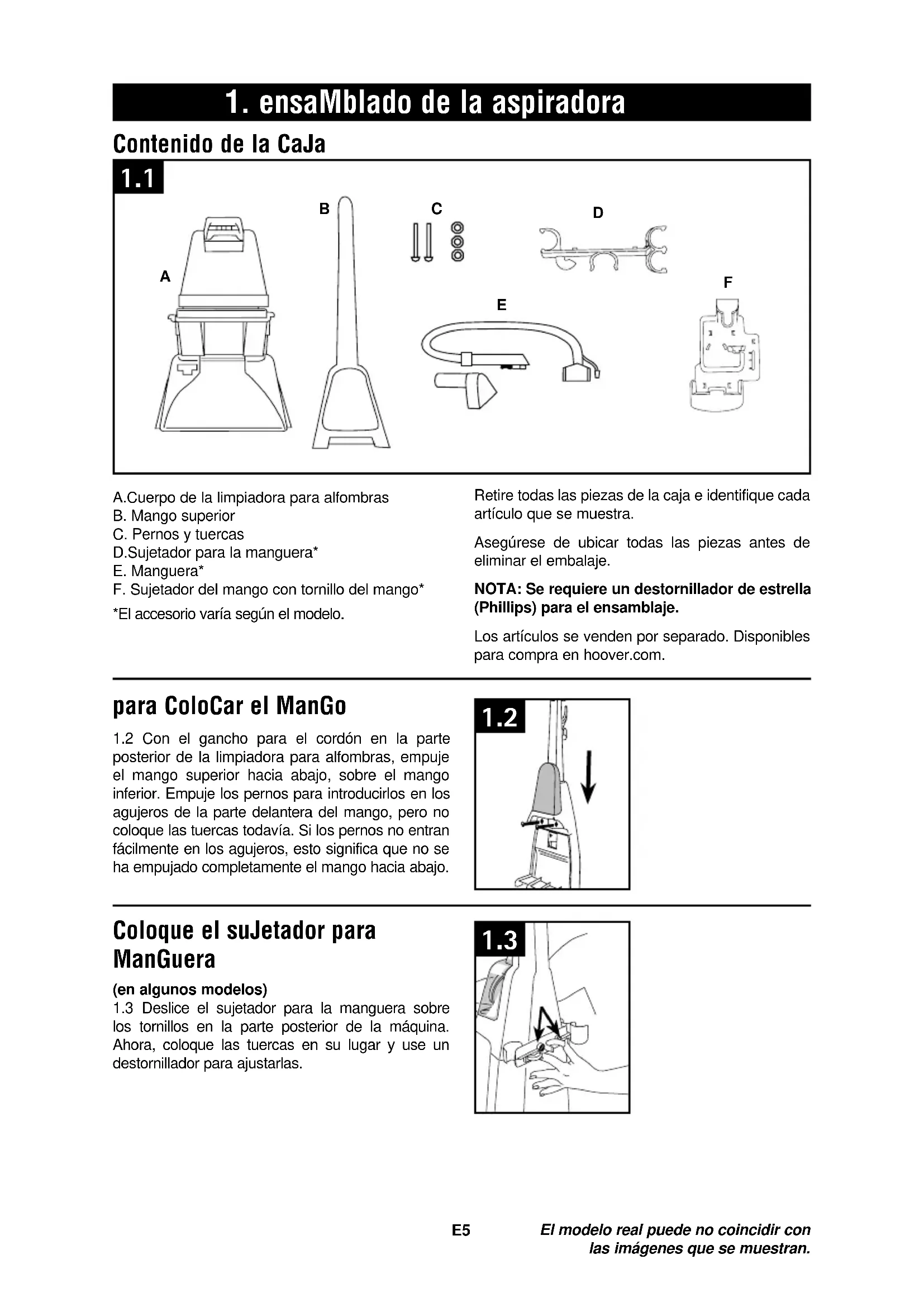 A1. ensaMblado de la aspiradora Contenido de la Caja A.Cuerpo de la limpiadora para alfombras B. Mango superior C. Pernos y tuercas D.Sujetador para la manguera* E. Manguera* F. Sujetador del mango con tornillo del mango* *El accesorio varía según el modelo.