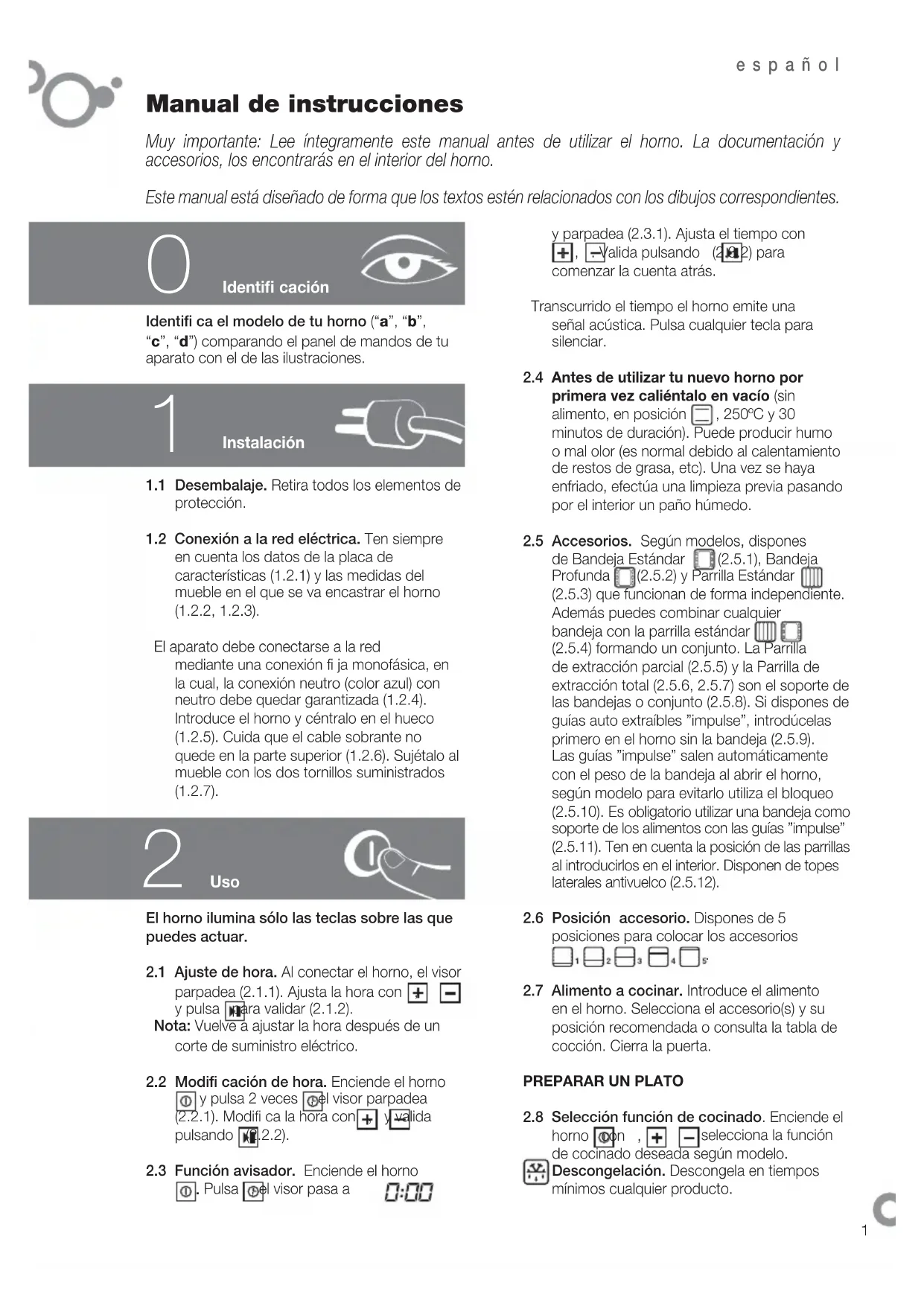 Manual de instrucciones Muy importante: Lee íntegramente este manual antes de utilizar el horno. La documentación y accesorios, los encontrarás en el interior del horno. Este manual está diseñado de forma que los textos estén relacionados con los dibujos correspondientes.