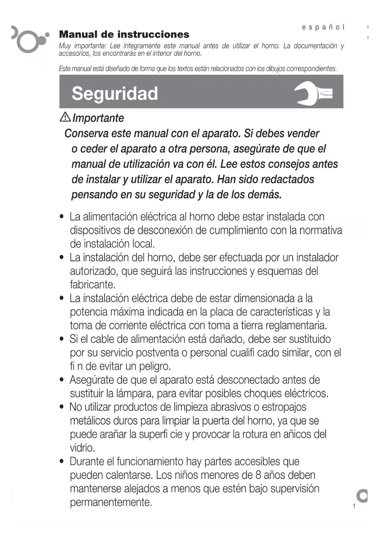 Manual de instrucciones Muy importante: Lee íntegramente este manual antes de utilizar el horno. La documentación y accesorios, los encontrarás en el interior del horno. Este manual está diseñado de forma que los textos están relacionados con los dibujos correspondientes. Seguridad