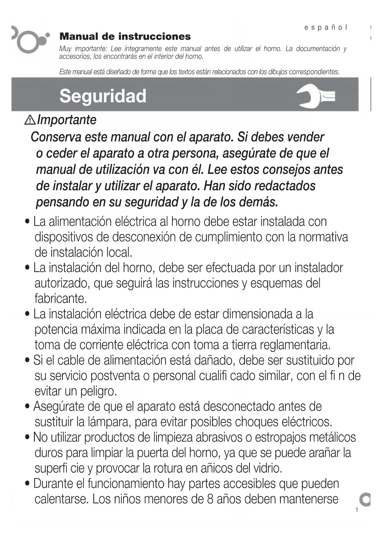 Manual de instrucciones Muy importante: Lee íntegramente este manual antes de utilizar el horno. La documentación y accesorios, los encontrarás en el interior del horno. Este manual está diseñado de forma que los textos están relacionados con los dibujos correspondientes. Seguridad