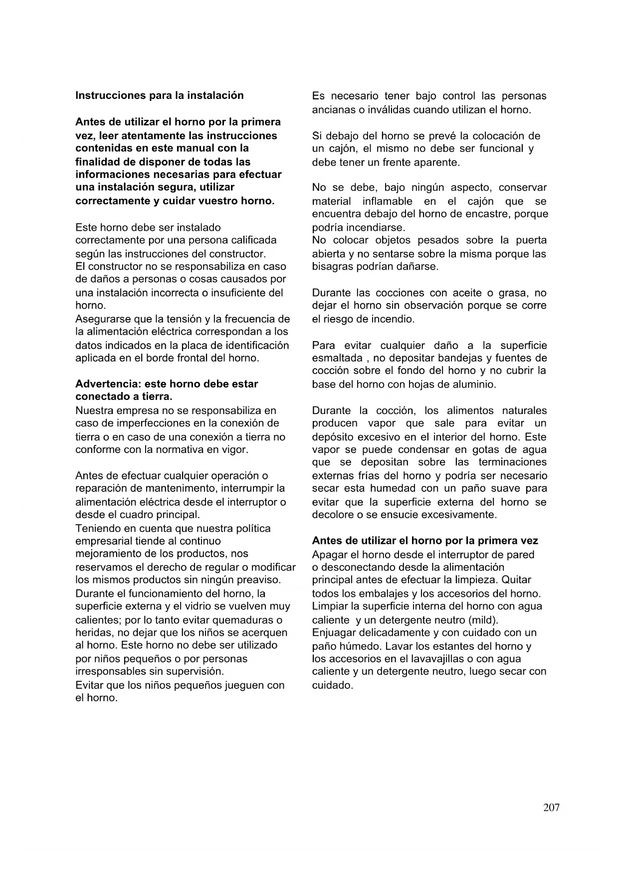 Bereidingstijd (min) Symbool bereiding Gebak Tulbanden 180 2 55-65 Vruchtentaarten 200 1 30-40 Gebak van melk en boter 180 2 35-40 Gerezen gebak 200 1 25-35 Soezen 190 2 20-30 Bladerdeeg 200 2 15-25 Biscuits 190 3 15-20 Lasagne 225 2 40-50 Vlees Runderbiefstuk 225 2-3 50-80 Roastbeef 225 2-3 50-80 Gebraad van kalfsvlees 225 2-3 60-80 Gebraad van varkensvlees 170-180 2 45-60 Gebraad van lamsvlees 225 2 45-55 Gebraad van rundvlees 225 2-3 50-60 Gebraad van haas 200 2 60-90 Gebraad van kalkoen 180 2 240 circa Gebraad van gans 200 2 150-210 Gebraad van eend 200 2 120-180 Gebraad van kip 200 2 60-90 Reebout 200 2-3 90-150 Hertenbout 180 2-3 90-180 Vis 180 2-3 10-40 Groenten Gestoofde groenten 170-190 2-3 40-50 Pizza 240 1 15-25 Bereiding onder de grill Karbonade 4 8-12 Saucijsjes van varkensvlees 4 10-13 Gegrilde kip 3 25-35 Kip aan het spies 50-65 Kalfsgebraad aan het spies 50-65 206Instrucciones para la instalación Antes de utilizar el horno por la primera vez, leer atentamente las instrucciones contenidas en este manual con la finalidad de disponer de todas las informaciones necesarias para efectuar una instalación segura, utilizar correctamente y cuidar vuestro horno. Este horno debe ser instalado correctamente por una persona calificada según las instrucciones del constructor. El constructor no se responsabiliza en caso de daños a personas o cosas causados por una instalación incorrecta o insuficiente del horno. Asegurarse que la tensión y la frecuencia de la alimentación eléctrica correspondan a los datos indicados en la placa de identificación aplicada en el borde frontal del horno. Advertencia: este horno debe estar conectado a tierra. Nuestra empresa no se responsabiliza en caso de imperfecciones en la conexión de tierra o en caso de una conexión a tierra no conforme con la normativa en vigor. Antes de efectuar cualquier operación o reparación de mantenimento, interrumpir la alimentación eléctrica desde el interruptor o desde el cuadro principal. Teniendo en cuenta que nuestra política empresarial tiende al continuo mejoramiento de los productos, nos reservamos el derecho de regular o modificar los mismos productos sin ningún preaviso. Durante el funcionamiento del horno, la superficie externa y el vidrio se vuelven muy calientes; por lo tanto evitar quemaduras o heridas, no dejar que los niños se acerquen al horno. Este horno no debe ser utilizado por niños pequeños o por personas irresponsables sin supervisión. Evitar que los niños pequeños jueguen con el horno. Es necesario tener bajo control las personas ancianas o inválidas cuando utilizan el horno. Si debajo del horno se prevé la colocación de un cajón, el mismo no debe ser funcional y debe tener un frente aparente. No se debe, bajo ningún aspecto, conservar material inflamable en el cajón que se encuentra debajo del horno de encastre, porque podría incendiarse. No colocar objetos pesados sobre la puerta abierta y no sentarse sobre la misma porque las bisagras podrían dañarse. Durante las cocciones con aceite o grasa, no dejar el horno sin observación porque se corre el riesgo de incendio. Para evitar cualquier daño a la superficie esmaltada , no depositar bandejas y fuentes de cocción sobre el fondo del horno y no cubrir la base del horno con hojas de aluminio. Durante la cocción, los alimentos naturales producen vapor que sale para evitar un depósito excesivo en el interior del horno. Este vapor se puede condensar en gotas de agua que se depositan sobre las terminaciones externas frías del horno y podría ser necesario secar esta humedad con un paño suave para evitar que la superficie externa del horno se decolore o se ensucie excesivamente. Antes de utilizar el horno por la primera vez Apagar el hor no desde el interruptor de pared o desconectando desde la alimentación principal antes de efectuar la limpieza. Quitar todos los embalajes y los accesorios del horno. Limpiar la superficie interna del horno con agua caliente y un detergente neutro (mild). Enjuagar delicadamente y con cuidado con un paño húmedo. Lavar los estantes del horno y los accesorios en el lavavajillas o con agua caliente y un detergente neutro, luego secar con cuidado. 207Datos Técnicos Este aparejo está conforme a las directivas 72/23 CEE y 93/68 CEE EMC 89/336 CEE. Normas sobre la tensión 230 V~50Hz fase + neutro. Dimensiones horno de encastre (mm) : Longitud : 440 Profundidad : 390 Altura : 340 Volumen : 59 Litros Energía máxima absorbida del horno : 3,1 kW Elementos: Instalación del horno en el mueble IMPORTANTE : La unidad debe ser instalada correctamente según las instrucciones de la Empresa constructora y por personal calificado. Antes de efectuar cualquier reparación u operación de mantenimiento, es necesario desconectar el horno de la alimentación eléctrica. CONEXIÓN ELÉCTRICA : Antes de conectar el horno a la alimentación eléctrica, asegurarse que: