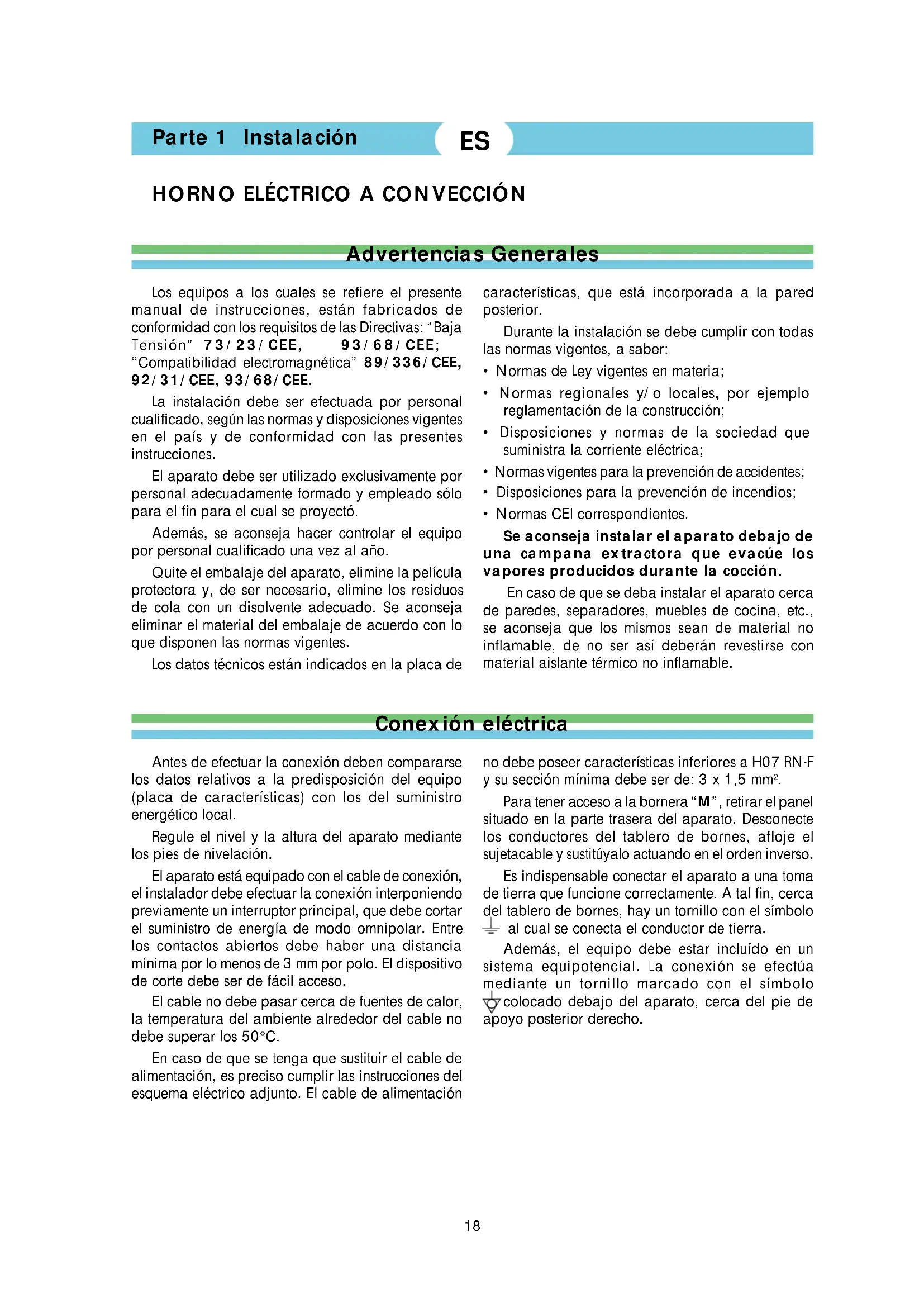 - Normas CEI correspondientes. Se aconseja instalar el aparato debajo de una campana extractora que evacúe los vapores producidos durante la cocción. En caso de que se deba instalar el aparato cerca de paredes, separadores, muebles de cocina, etc., se aconseja que los mismos sean de material no inflamable, de no ser así deberán revestirse con material aislante térmico no inflamable. no debe poseer características inferiores a H07 RN-F y su sección mínima debe ser de: 3 x 1,5 mm