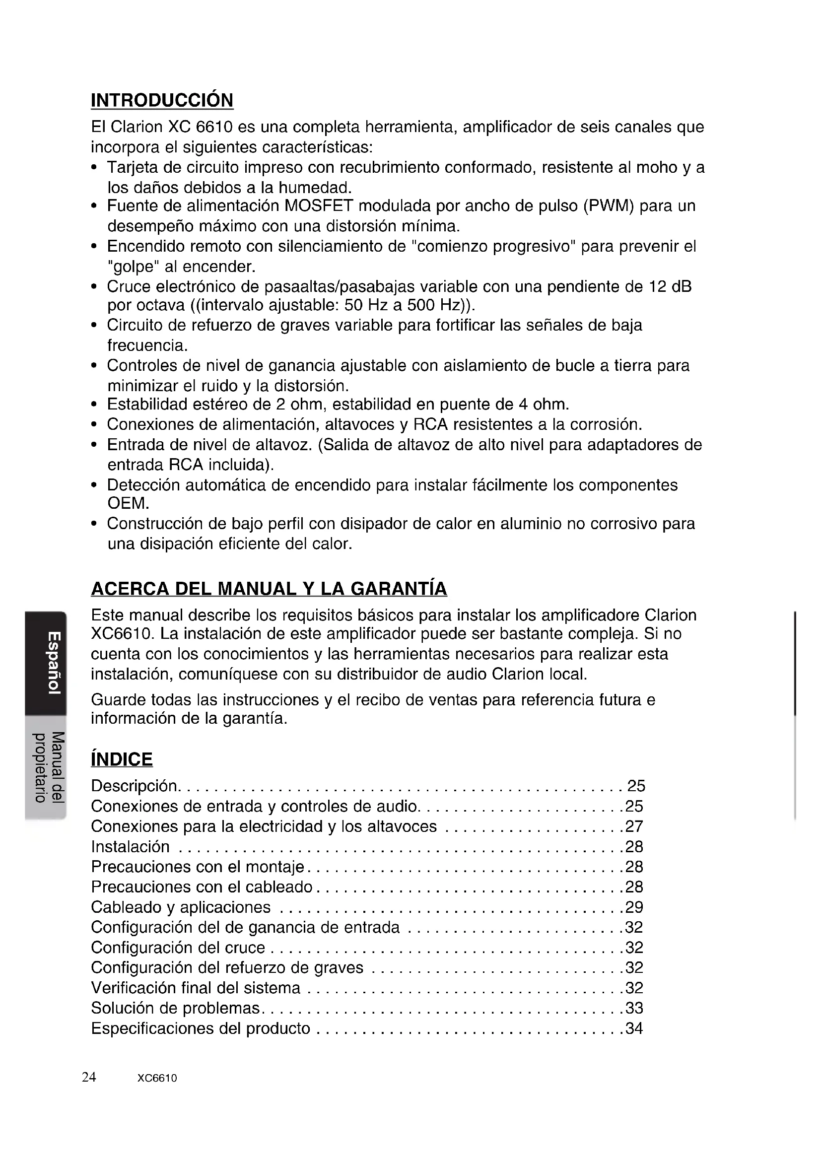 - Construcción de bajo perfil con disipador de calor en aluminio no corrosivo para una disipación eficiente del calor. ACERCA DEL MANUAL Y LA GARANTÍA Este manual describe los requisitos básicos para instalar los amplificadore Clarion XC6610. La instalación de este amplificador puede ser bastante compleja. Si no cuenta con los conocimientos y las herramientas necesarios para realizar esta instalación, comuníquese con su distribuidor de audio Clarion local. Guarde todas las instrucciones y el recibo de ventas para referencia futura e información de la garantía. ÍNDICE Descripción.................................................25 Conexiones de entrada y controles de audio.......................25 Conexiones para la electricidad y los altavoces ....................27 Instalación .................................................28 Precauciones con el montaje...................................28 Precauciones con el cableado ..................................28 Cableado y aplicaciones ......................................29 Configuración del de ganancia de entrada ........................32 Configuración del cruce .......................................32 Configuración del refuerzo de graves ............................32 Verificación final del sistema ...................................32 Solución de problemas........................................33 Especificaciones del producto ..................................34XC6610 25 Español Manual del propietario DESCRIPCIÓN El XC6610 usan una fuente de alimentación regulada por PWM para ofrecer un sonido y una potencia de salida de nivel superior. Todas las conexiones y controles para el XC6610 están etiquetadas y situadas convenientemente por un lado del amplificador. Para garantizar las mejores conexiones eléctricas posibles, las entradas de potencia, altavoces y RCA son resistentes a la corrosión. Como beneficio adicional, el XC6610 tiene la capacidad de crear una configuración de 3, 4, 5 ó 6 canales. En caso de una falla o corto circuito de un componente, el XC6610 integran circuitos de protección y protección con fusible ATC para prevenir daños al amplificador. CONEXIONES DE ENTRADA Y CONTROLES DE AUDIO El panel frontal de la XC6610 contiene dos conexiones RCA para altavoz y el nivel de insumos, junto con el audio controla como se muestra a continuación.
