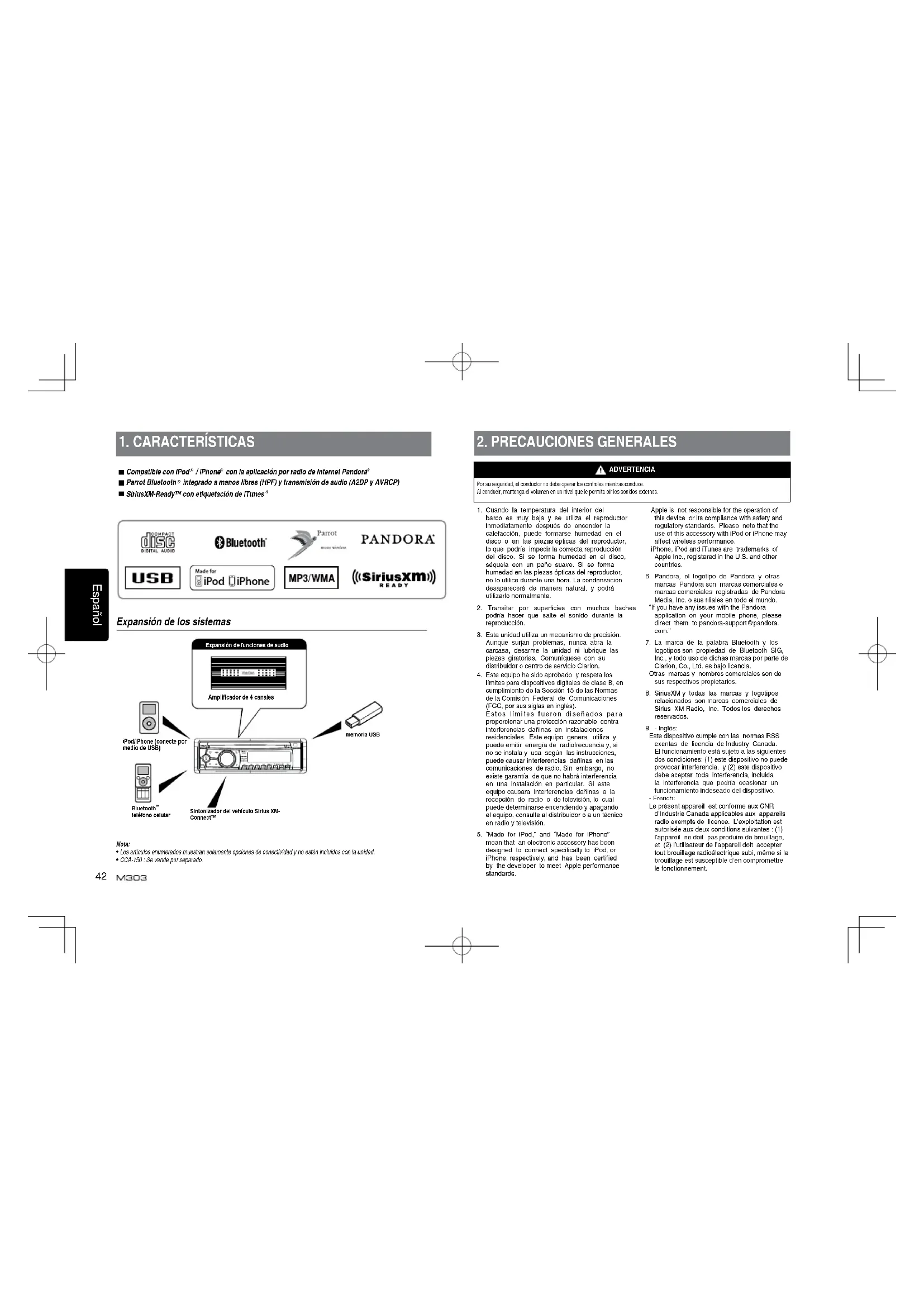 Por su seguridad, el conductor no debe operar los controles mientras conduce. Al conducir, mantenga el volumen en un nivel que le permita oír los sonidos externos.1. Cuando la temperatura del interior del barco es muy baja y se utiliza el reproductor inmediatamente después de encender la calefacción, puede formarse humedad en el disco o en las piezas ópticas del reproductor, lo que podría impedir la correcta reproducción del disco. Si se forma humedad en el disco, séquela con un paño suave. Si se forma humedad en las piezas ópticas del reproductor, no lo utilice durante una hora. La condensación desaparecerá de manera natural, y podrá utilizarlo normalmente.2. Transitar por supercies con muchos baches podría hacer que salte el sonido durante la reproducción.3. Esta unidad utiliza un mecanismo de precisión. Aunque surjan problemas, nunca abra la carcasa, desarme la unidad ni lubrique las piezas giratorias. Comuníquese con su distribuidor o centro de servicio Clarion.4. Este equipo ha sido aprobado y respeta los límites para dispositivos digitales de clase B, en cumplimiento de la Sección 15 de las Normas de la Comisión Federal de Comunicaciones (FCC, por sus siglas en inglés). Es t os lí m i te s f ue r o n di se ñ ad o s pa r a proporcionar una protección razonable contra interferencias dañinas en instalaciones residenciales. Este equipo genera, utiliza y puede emitir energía de radiofrecuencia y, si no se instala y usa según las instrucciones, puede causar interferencias dañinas en las comunicaciones de radio. Sin embargo, no existe garantía de que no habrá interferencia en una instalación en particular. Si este equipo causara interferencias dañinas a la recepción de radio o de televisión, lo cual puede determinarse encendiendo y apagando el equipo, consulte al distribuidor o a un técnico en radio y televisión. 5. “Made for iPod,” and “Made for iPhone” mean that an electronic accessory has been designed to connect specifically to iPod, or iPhone, respectively, and has been certified by the developer to meet Apple performance standards. ADVERTENCIA Apple is not responsible for the operation of this device or its compliance with safety and regulatory standards. Please note that the use of this accessory with iPod or iPhone may affect wireless performance. iPhone, iPod and iTunes are trademarks of Apple Inc., registered in the U.S. and other countries.6. Pandora, el logotipo de Pandora y otras marcas Pandora son marcas comerciales o marcas comerciales registradas de Pandora Media,Inc.osuslialesentodoelmundo. “If you have any issues with the Pandora application on your mobile phone, please direct them to pandora-support@pandora.com.”7. La marca de la palabra Bluetooth y los logotipos son propiedad de Bluetooth SIG, Inc., y todo uso de dichas marcas por parte de Clarion, Co., Ltd. es bajo licencia. Otras marcas y nombres comerciales son de sus respectivos propietarios.8. SiriusXM y todas las marcas y logotipos relacionados son marcas comerciales de Sirius XM Radio, Inc. Todos los derechos reservados.9. - Inglés: Este dispositivo cumple con las normas RSS exentas de licencia de Industry Canada. El funcionamiento está sujeto a las siguientes dos condiciones: (1) este dispositivo no puede provocar interferencia, y (2) este dispositivo debe aceptar toda interferencia, incluida la interferencia que podría ocasionar un funcionamiento indeseado del dispositivo. - French: Le présent appareil est conforme aux CNR d’Industrie Canada applicables aux appareils radio exempts de licence. L’exploitation est autorisée aux deux conditions suivantes : (1) l’appareil ne doit pas produire de brouillage, et (2) l’utilisateur de l’appareil doit accepter tout brouillage radioélectrique subi, même si le brouillage est susceptible d’en compromettre le fonctionnement.Bluetooth teléfono celularSintonizador del vehículo Sirius XM-Connect™memoria USBEspañol