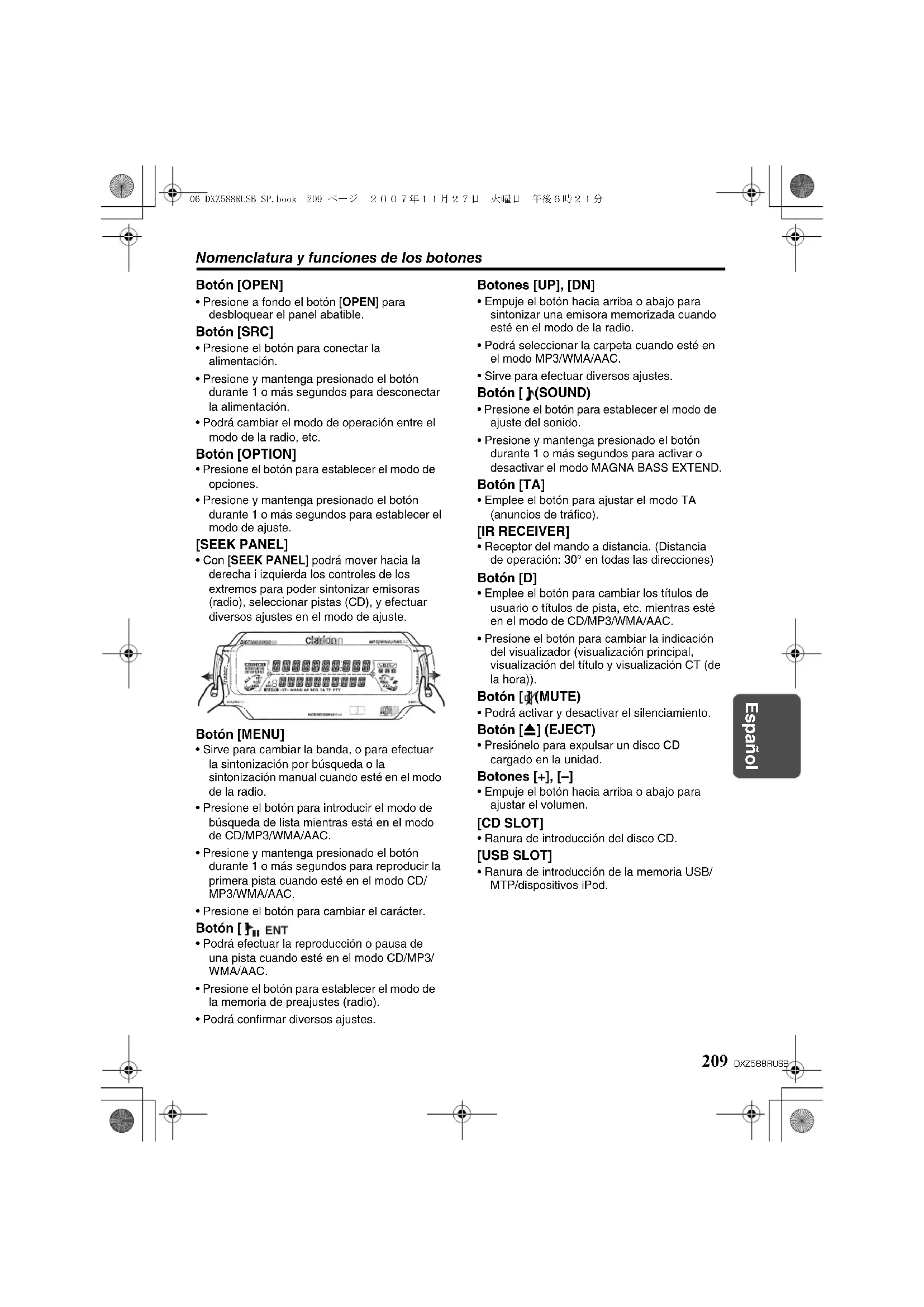 Indicación del restaurador de sonido : Indicación de Bluetooth ST : Indicación de estéreo (sólo la radio) MANU : Indicación de manual AF : Indicación de frecuencia alternativa REG : Indicación regional TA : Indicación de anuncio de tráfico TP : Indicación de programa de tráfico PTY : Indicación del tipo de programa : Indicación del N.° de disco Indicación de canal preajustado (1 a 6) : Indicación de los graves de MAGNA BASS EX : Indicación de disco o de carpeta : Indicación de reproducción aleatoria : Indicación de repetición : Indicación de exploración : Indicación de introducir : Indicación de silenciamiento ALL : Indicación de la fuente Se visualiza CD, USB, etc. Indicación del estado de operación Se visualizan la fuente, los títulos, la función, el ajuste, la hora, etc. Indicación del estado de operación Se visualizan los títulos, la frecuencia, la banda, el canal, el tiempo de reproducción, etc. 06_DXZ588RUSB_SP.book 210 ページ 2007年11月27日 火曜日 午後6時21分211 DXZ588RUSB Español
