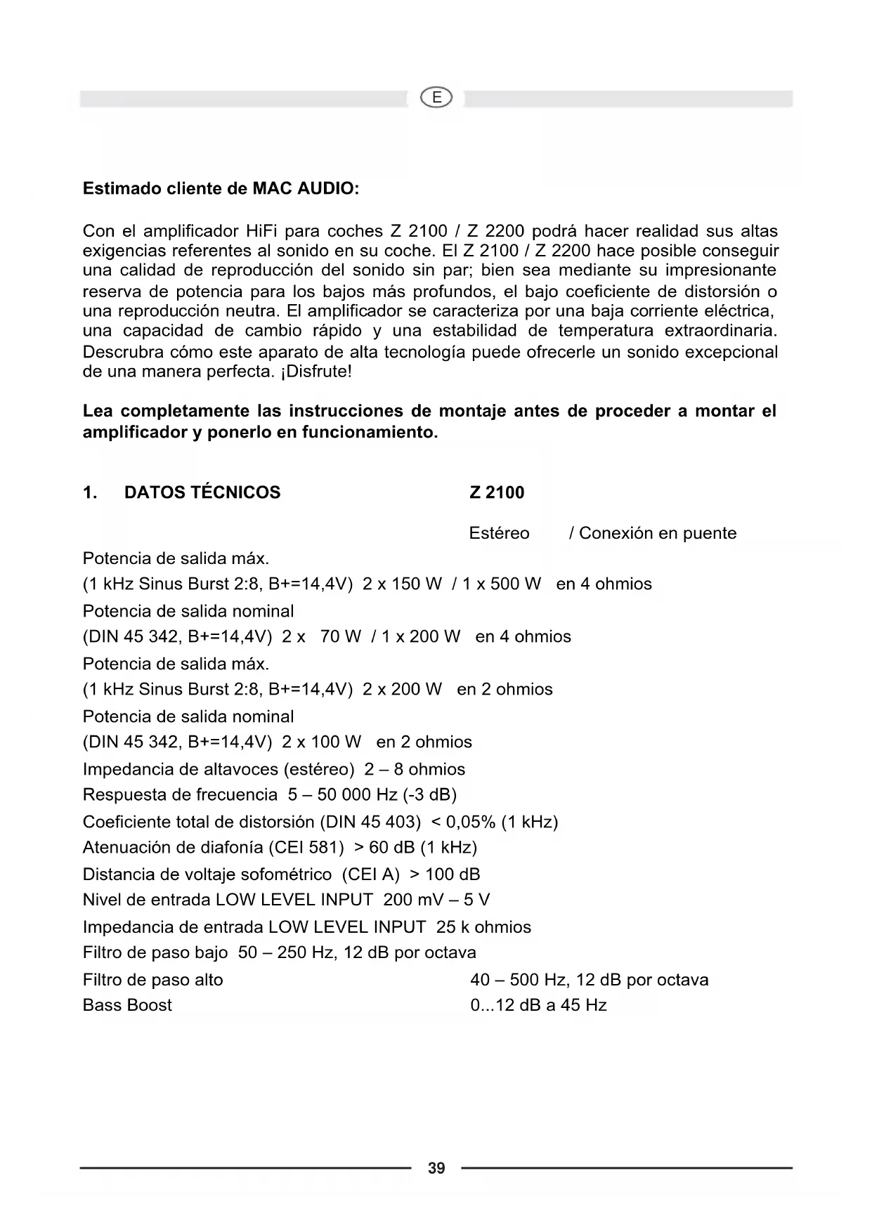 Estimado cliente de MAC AUDIO: Con el amplificador HiFi para coches Z 2100 / Z 2200 podrá hacer realidad sus altas exigencias referentes al sonido en su coche. El Z 2100 / Z 2200 hace posible conseguir una calidad de reproducción del sonido sin par; bien sea mediante su impresionante reserva de potencia para los bajos más profundos, el bajo coeficiente de distorsión o una reproducción neutra. El amplificador se caracteriza por una baja corriente eléctrica, una capacidad de cambio rápido y una estabilidad de temperatura extraordinaria. Descrubra cómo este aparato de alta tecnología puede ofrecerle un sonido excepcional de una manera perfecta. ¡Disfrute! Lea completamente las instrucciones de montaje antes de proceder a montar el amplificador y ponerlo en funcionamiento.