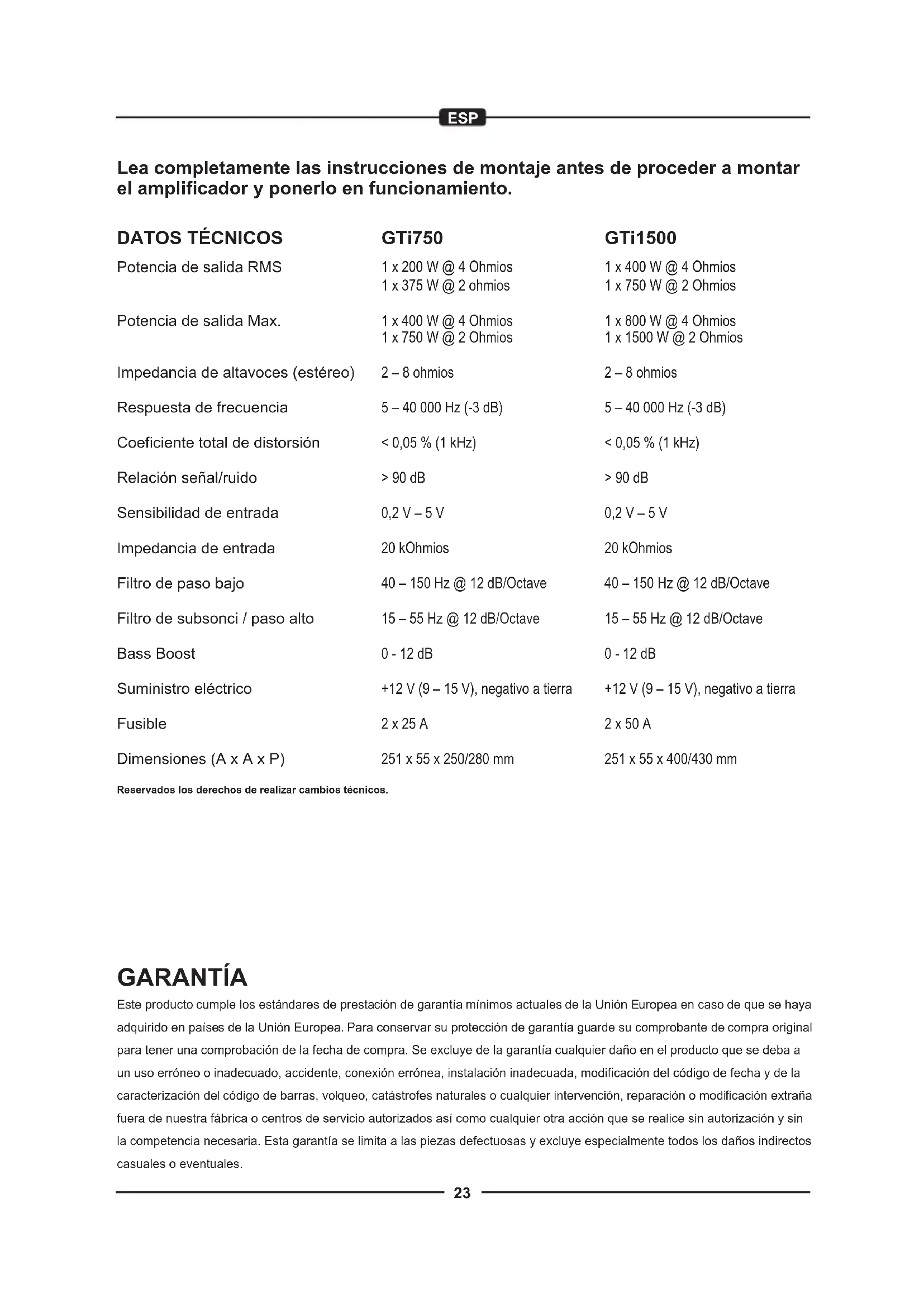 +12 V (9 – 15 V), negativo a tierra 2 x 25 A 251 x 55 x 250/280 mm GARANTÍA Este producto cumple los estándares de prestación de garantía mínimos actuales de la Unión Europea en caso de que se haya adquirido en países de la Unión Europea. Para conservar su protección de garantía guarde su comprobante de compra original para tener una comprobación de la fecha de compra. Se excluye de la garantía cualquier daño en el producto que se deba a un uso erróneo o inadecuado, accidente, conexión errónea, instalación inadecuada, modificación del código de fecha y de la caracterización del código de barras, volqueo, catástrofes naturales o cualquier intervención, reparación o modificación extraña fuera de nuestra fábrica o centros de servicio autorizados así como cualquier otra acción que se realice sin autorización y sin la competencia necesaria. Esta garantía se limita a las piezas defectuosas y excluye especialmente todos los daños indirectos casuales o eventuales. GTi1500 1 x 400 W @ 4 Ohmios 1 x 750 W @ 2 Ohmios 1 x 800 W @ 4 Ohmios 1 x 1500 W @ 2 Ohmios 2 – 8 ohmios 5 – 40 000 Hz (-3 dB) < 0,05 % (1 kHz) > 90 dB 0,2 V – 5 V 20 kOhmios 40 – 150 Hz @ 12 dB/Octave 15 – 55 Hz @ 12 dB/Octave