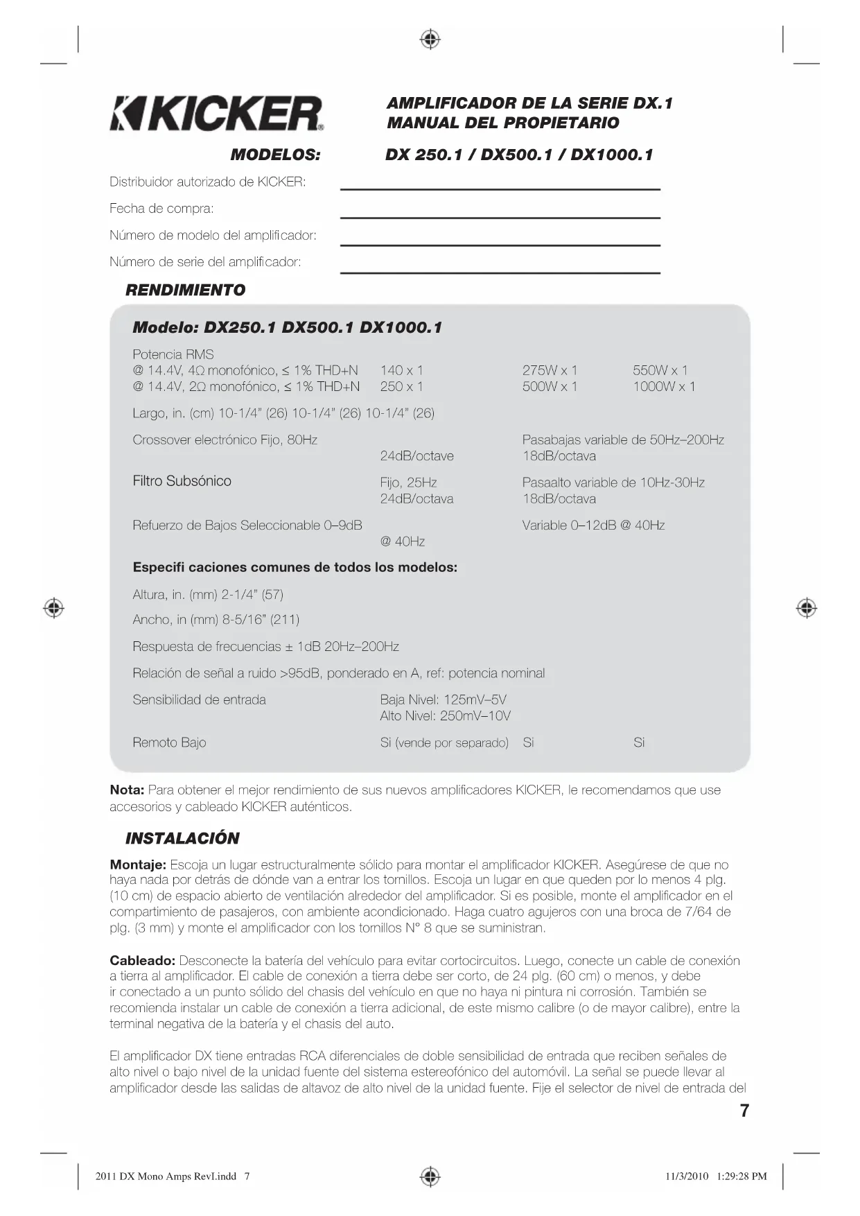 encaje en el soporte de metal 2011 DX Mono Amps RevI.indd 102011 DX Mono Amps RevI.indd 10 11/3/2010 1:29:29 PM11/3/2010 1:29:29 PM11 ¿Hay baja respuesta de bajos? Invierta la conexión de uno de los altavoces de positiva a negativa en los canales estereofónicos y/o de subwoofer; si los bajos mejoran, el altavoz estaba fuera de fase. ¿Hay ruido de conexión a tierra? Los amplifi cadores KICKER son totalmente compatibles con las unidades fuente de todos los fabricantes. Algunas unidades principales pueden necesitar más conexión a tierra para evitar que entre ruido a la señal de audio. En la mayoría de los casos, este problema con la unidad principal se resuelve instalando un cable de conexión a tierra desde las salidas RCA de la unidad principal al chasis. Nota importante: Los altavoces modernos de alto rendimiento tienen menos resistencia a la CC que los de antes. Los altavoces de componente o coaxiales de KICKER tienen un valor nominal de 4Ω (algunas resistencias de CC pueden llegar a 3Ω) y funcionan con cualquier unidad fuente o amplifi cador diseñado para funcionar con 4Ω de carga. Si desea utilizar dos altavoces de componente o coaxiales de KICKER en un solo canal de su amplifi cador, conéctelos en serie. Esto mejora la calidad del sonido, reduce la distorsión armónica total y disminuye la carga térmica en la unidad fuente o amplifi cador. Esto puede evitar que el amplifi cador se apague a causa del circuito de protección contra exceso de corriente. PRECAUCIÓN: Cuando haga arrancar el vehículo con cables de arranque conectados a una batería externa, asegúrese de que las conexiones de los cables de arranque sean correctas. Conectar los cables de arranque de manera incorrecta puede quemar los fusibles del amplifi cador y causar fallas en otros sistemas del vehículo. Si tiene más preguntas sobre la instalación de su nuevo producto KICKER, vaya al distribuidor autorizado de KICKER donde lo compró. Si necesita más consejos sobre la instalación, haga clic en la lengüeta SUPPORT (apoyo) de la página Web de KICKER, www.kicker.com. Escoja la lengüeta TECHNICAL SUPPORT (apoyo técnico), escoja el tema que le interese y luego descargue o vea la información correspondiente. Envíe un mensaje por correo electrónico a support@kicker.com o comuníquese con Servicios Técnicos llamando al (405) 624-8583 si tiene preguntas específi cas o a las cuales no haya encontrado respuesta. DX250.1 140 x 1 @ 4 ohmios, 14.4VCC, 1% THD, CEA-2006 (W) Relación de Señal a Ruido -75dB CEA-2006 (ref: 1W, ponderado en A) DX500.1 275 x 1 @ 4 ohmios, 14.4VCC, 1% THD, CEA-2006 (W) Relación de Señal a Ruido -75dB CEA-2006 (ref: 1W, ponderado en A) DX1000.1 550 x 1 @ 4 ohmios, 14.4VCC, 1% THD, CEA-2006 (W) Relación de Señal a Ruido -75dB CEA-2006 (ref: 1W, ponderado en A) 2011 DX Mono Amps RevI.indd 112011 DX Mono Amps RevI.indd 11 11/3/2010 1:29:29 PM11/3/2010 1:29:29 PM12 Modell: DX250.1 DX500.1 DX1000.1 RMS-Leistung @ 14.4V, 4Ω mono, 1% Gesamtklirrfaktor @ 14.4V, 2Ω mono, 1% Gesamtklirrfaktor 140 x 1 250 x 1 275W x 1 500W x 1 550W x 1 1000W x 1 Länge, Zoll (cm) 10-1/4” (26) 10-1/4” (26) 10-1/4” (26) Elektronischer Crossover Fixed, 80Hz 24dB/oktave Variabel tiefpass 50Hz–200Hz 18dB/oktave Subsonic-Filter Fixed, 25Hz 24dB/oktave Variabel hi-pass 10Hz-30Hz 18dB/oktave Bass-Boost Wählbar 0–9dB @ 40Hz Variabel 0–12dB @ 40 Hz Für alle Modelle gültige Werte: Höhe, Zoll (mm) 2-1/4” (57) Breite, Zoll (mm) 8-5/16” (211) Frequenzgang ± 1dB 20Hz–200Hz Rauschabstand >95dB, A-gewichtet, re: Nennleistung Eingangsempfi ndlichkeit N-Pegel: 125mV–5V H-Pegel: 250mV–10V Fern Bass Ja (separat erhältlich)Ja Ja