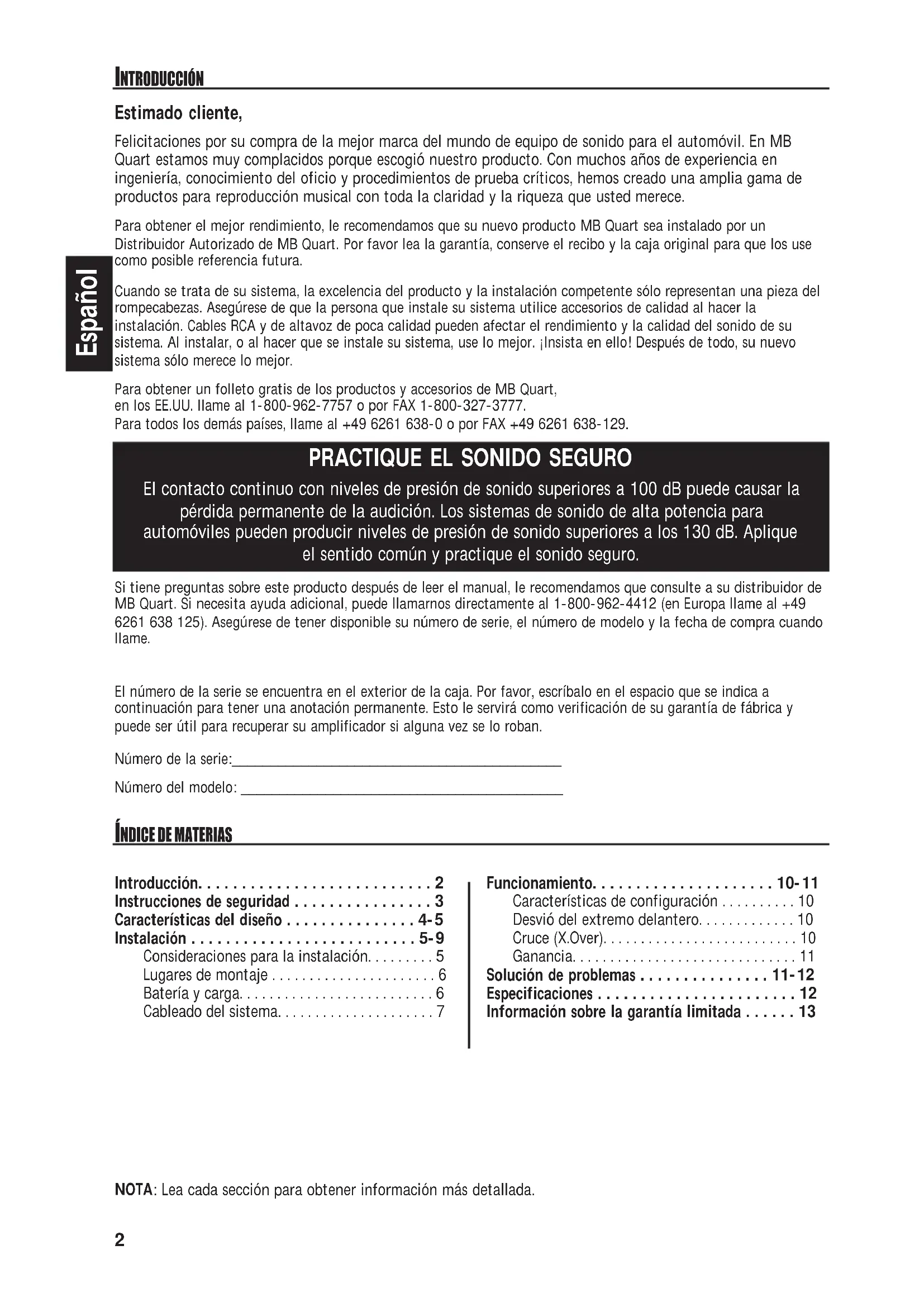 Bienvenidos a MB Quart! Este manual ha sido Creation para proportionsarle informacion al dueño, vendedor y techniciano de instalacion. Para quienes desean informacion rapiida sobre como instalar este producto, por favor vean la Seccion de Instalacion de este manual. El resto de la informacion possible encontrarse usingo el indices de Materiaias. Nosotros, en Rockford Fosgate hemos trabajo arduamente para asegurarlos que toda la informacion de este manual este actualizada. Ya que constantementeencionamos新品as formas para mejoramos produits, esta informacion está sujeta a Cambios sin previo aviso.