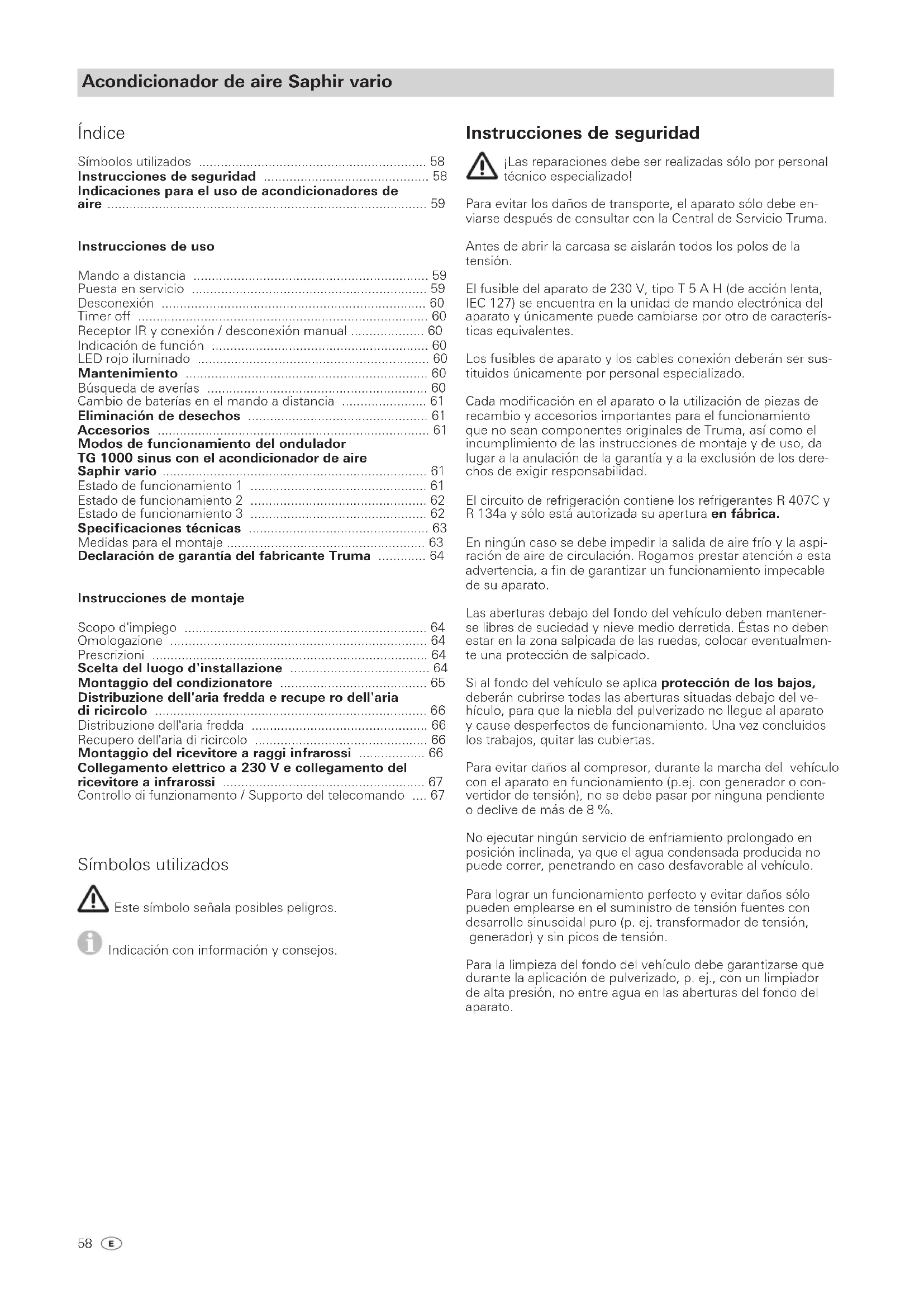 - Sæt stikket til strømkablet (15) i stikbøsningen. Stikket trækaf- lastes automatisk, når en tap går i hak. Tappen skal løftes med en skruetrækker for at trække stikket ud. Sæt stikket til IR-modtageren i stikbøsningen (16). Tilslutningen (17) anvendes, hvis klimaanlægget Saphir vario benyttes via omformeren Truma TG 1000 sinus (Com-tilslutning / kommunikation a eller b). Luk elektronikdækslet igen, skru skruerne (14) i. Kablerne skal have så meget plads, at anlægget kan trækkes ud af det dobbelte gulv med tilsluttede kabler. Alle kabler skal sikres med spænder! Ved vedligeholdelses- og reparationsarbejder skal der på køre- tøjssiden være en skilleanordning, der totalt bryder spændin- gen, med minimum 3,5 mm kontaktafstand. Funktionskontrol / Holder til fjernbetjeningen Placér holderen til fjernbetjeningen så tæt på modtageren (9) som muligt, så klimaanlægget fungerer uden at tage fjernbe- tjeningen ud af holderen. Til sidst skal alle anlæggets funktioner kontrolleres iht. brugsanvisningen. Brugsanvisningen skal udleveres til køretøjets ejer.58 Acondicionador de aire Saphir vario Símbolos utilizados Este símbolo señala posibles peligros. Indicación con información y consejos. Instrucciones de seguridad ¡Las reparaciones debe ser realizadas sólo por personal técnico especializado! Para evitar los daños de transporte, el aparato sólo debe en- viarse después de consultar con la Central de Servicio Truma. Antes de abrir la carcasa se aislarán todos los polos de la tensión. El fusible del aparato de 230 V, tipo T 5 A H (de acción lenta, IEC 127) se encuentra en la unidad de mando electrónica del aparato y únicamente puede cambiarse por otro de caracterís- ticas equivalentes. Los fusibles de aparato y los cables conexión deberán ser sus- tituidos únicamente por personal especializado. Cada modificación en el aparato o la utilización de piezas de recambio y accesorios importantes para el funcionamiento que no sean componentes originales de Truma, así como el incumplimiento de las instrucciones de montaje y de uso, da lugar a la anulación de la garantía y a la exclusión de los dere- chos de exigir responsabilidad. El circuito de refrigeración contiene los refrigerantes R 407C y R 134a y sólo está autorizada su apertura en fábrica. En ningún caso se debe impedir la salida de aire frío y la aspi- ración de aire de circulación. Rogamos prestar atención a esta advertencia, a fin de garantizar un funcionamiento impecable de su aparato. Las aberturas debajo del fondo del vehículo deben mantener- se libres de suciedad y nieve medio derretida. Éstas no deben estar en la zona salpicada de las ruedas, colocar eventualmen- te una protección de salpicado. Si al fondo del vehículo se aplica protección de los bajos, deberán cubrirse todas las aberturas situadas debajo del ve- hículo, para que la niebla del pulverizado no llegue al aparato y cause desperfectos de funcionamiento. Una vez concluidos los trabajos, quitar las cubiertas. Para evitar daños al compresor, durante la marcha del vehículo con el aparato en funcionamiento (p.ej. con generador o con- vertidor de tensión), no se debe pasar por ninguna pendiente o declive de más de 8 %. No ejecutar ningún servicio de enfriamiento prolongado en posición inclinada, ya que el agua condensada producida no puede correr, penetrando en caso desfavorable al vehículo. Para lograr un funcionamiento perfecto y evitar daños sólo pueden emplearse en el suministro de tensión fuentes con desarrollo sinusoidal puro (p. ej. transformador de tensión, generador) y sin picos de tensión. Para la limpieza del fondo del vehículo debe garantizarse que durante la aplicación de pulverizado, p. ej., con un limpiador de alta presión, no entre agua en las aberturas del fondo del aparato. Índice Símbolos utilizados p. 58