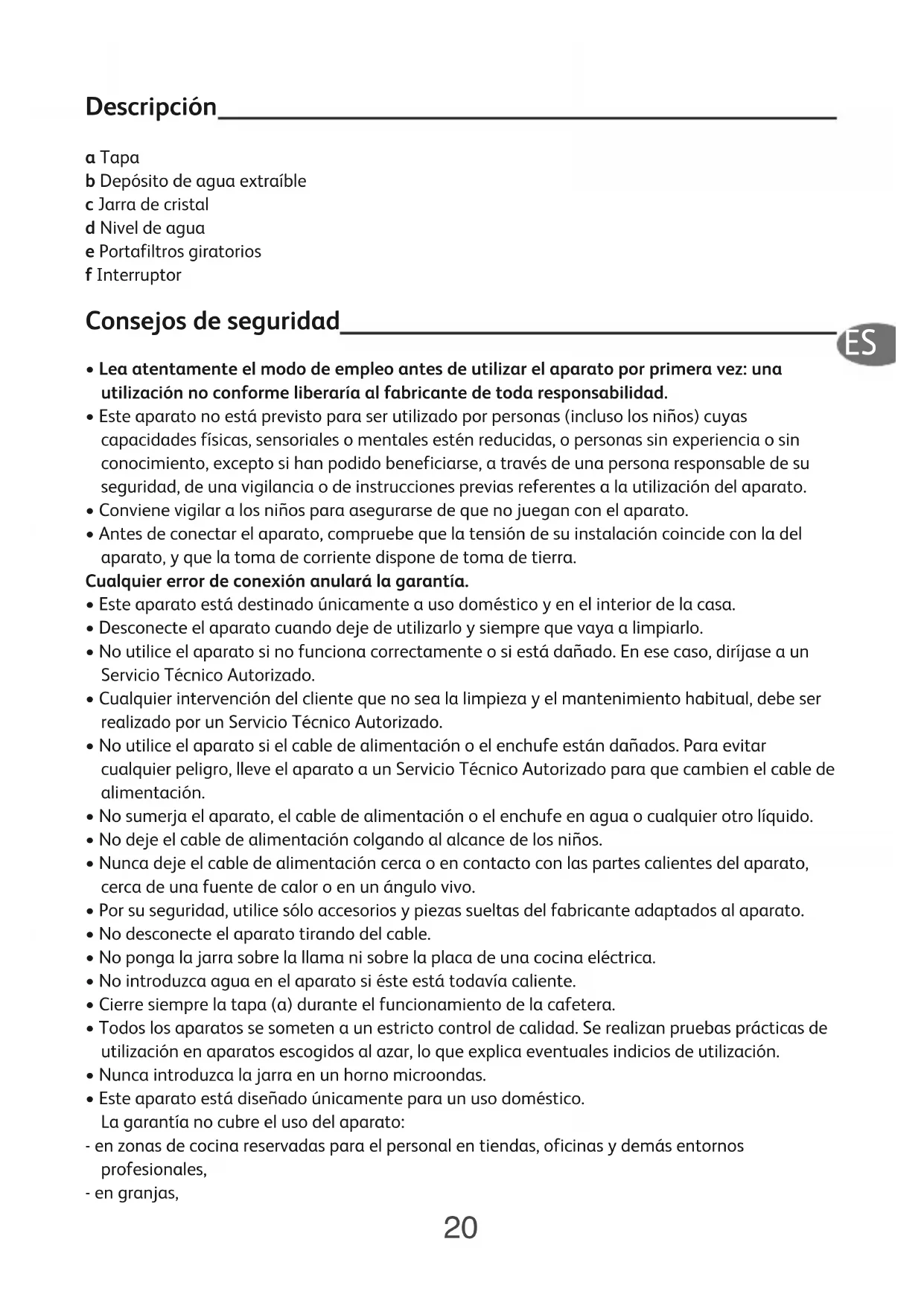 - Aclare la cafetera haciéndola funcionar 2 o 3 veces con 0,5 litro o 1 litro de agua (en función del modelo). La garantía excluye las cafeteras que funcionan mal o no funcionan por falta de descalcificación. Accesorios
