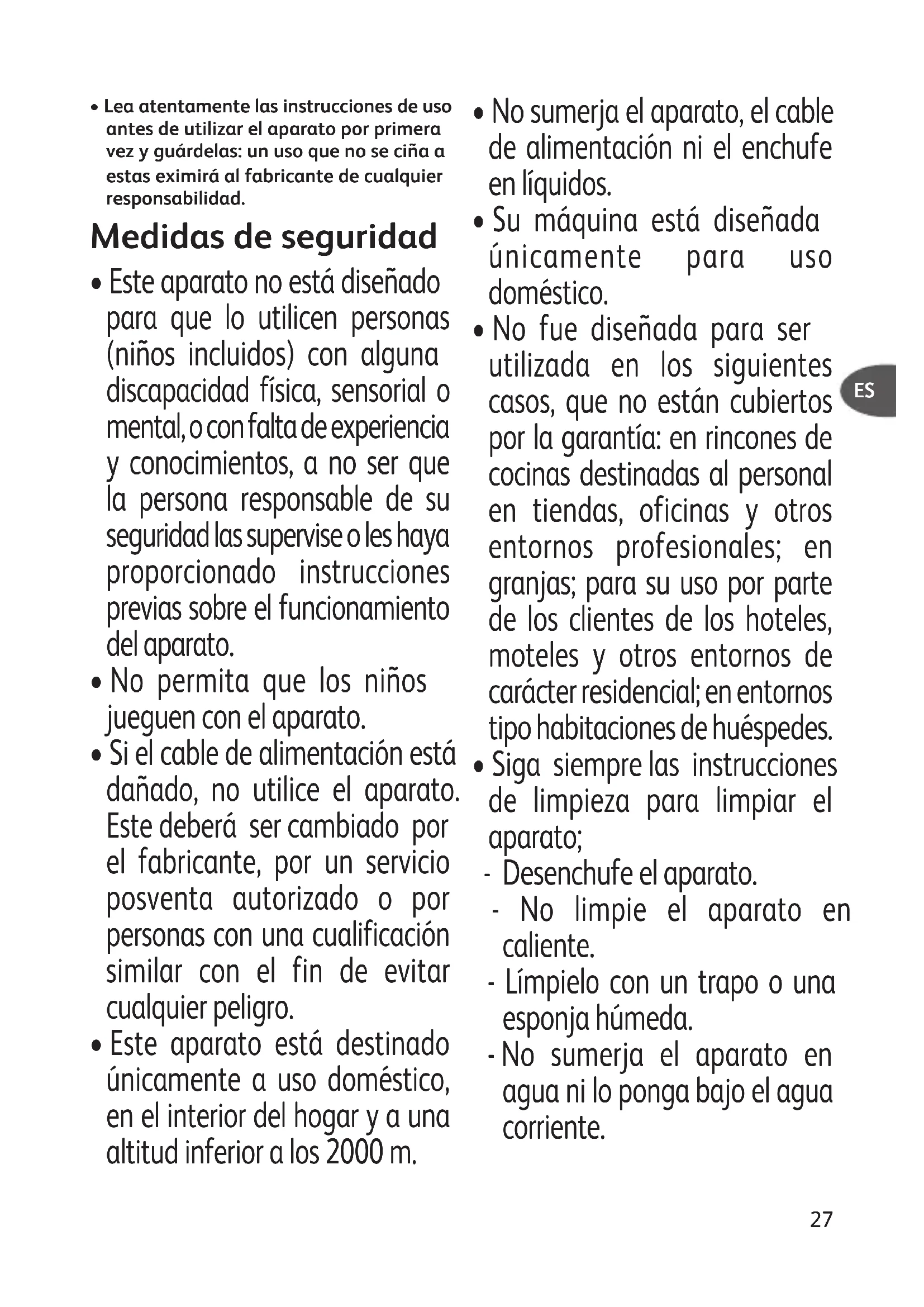 - Lea atentamente las instrucciones de uso antes de utilizar el aparato por primera vez y guárdelas: un uso que no se ciña a estas eximirá al fabricante de cualquier responsabilidad. Medidas de seguridad