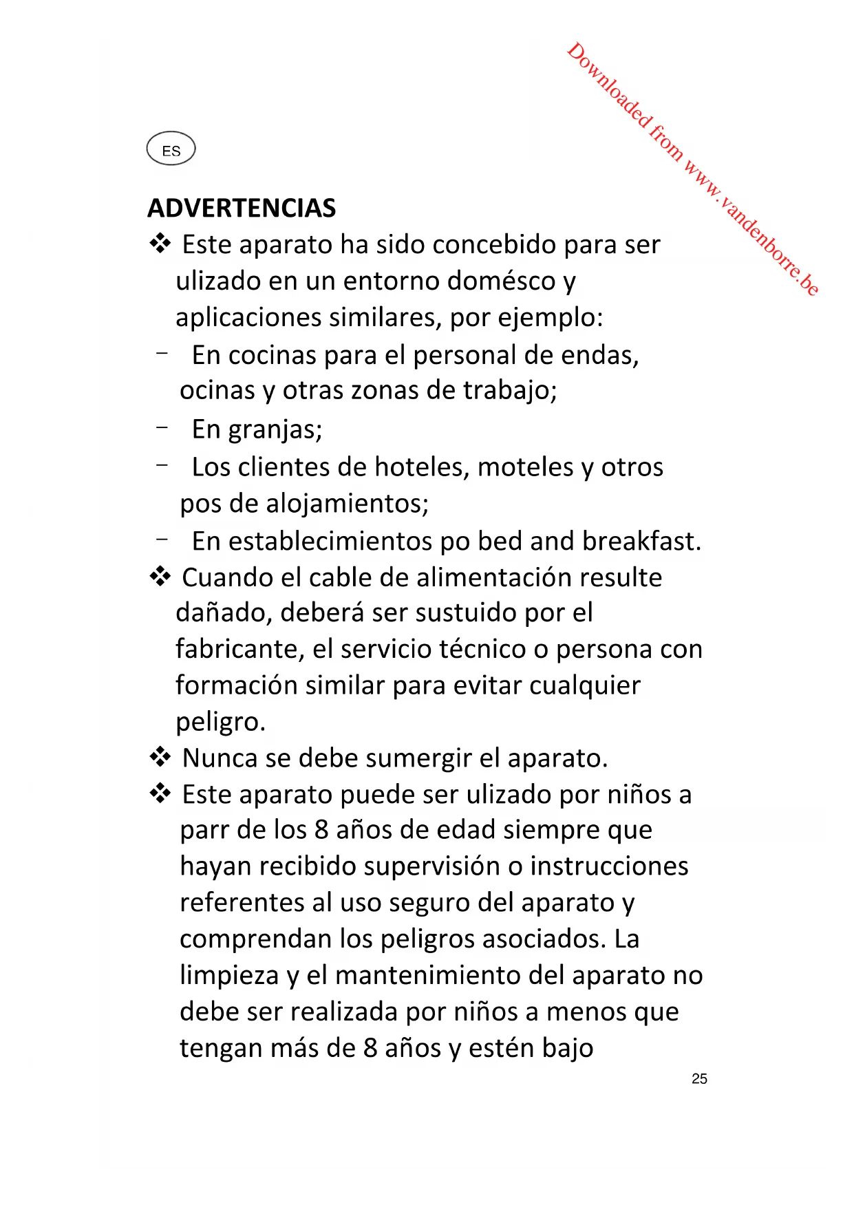 Downloaded from www.vandenborre.be26 supervisión. Mantenga el aparato y el cable de alimentación fuera del alcance de los niños menores de 8 años. Estos electrodoméstico pueden ser utilizados por personas con facultades físicas, sensoriales o mentales reducidas o sin experiencia ni conocimiento del producto siempre que hayan recibido supervisión o instrucciones sobre el uso seguro del aparato y comprendan los peligros asociados. Los niños no deben jugar con el aparato. Puede consultar la información sobre cómo limpiar las superficies en contacto con los alimentos y sobre descalcificación, en la sección “Limpieza y descalcificación” de la página 32. ADVERTENCIA: Podría sufrir lesiones si no utiliza este aparato correctamente. La superficie de la placa térmica se mantendrá caliente después del uso.
