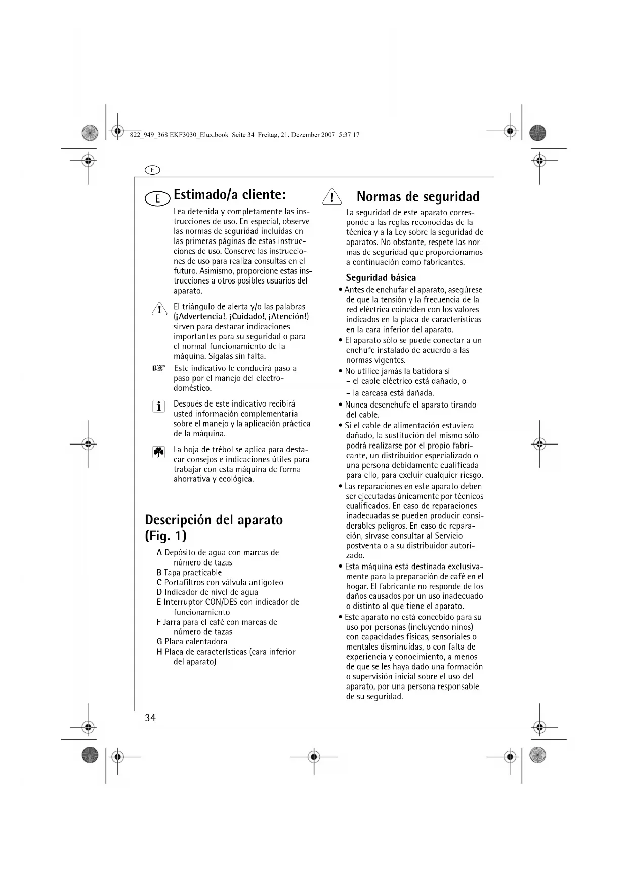 Estimado/a cliente: Lea detenida y completamente las ins-trucciones de uso. En especial, observe las normas de seguridad incluidas en las primeras páginas de estas instruc-ciones de uso. Conserve las instruccio-nes de uso para realiza consultas en el futuro. Asimismo, proporcione estas ins-trucciones a otros posibles usuarios del aparato. El triángulo de alerta y/o las palabras (¡Advertencia!, ¡Cuidado!, ¡Atención!) sirven para destacar indicaciones importantes para su seguridad o para el normal funcionamiento de la máquina. Sígalas sin falta.0 Este indicativo le conducirá paso a paso por el manejo del electro-doméstico. Después de este indicativo recibirá usted información complementaria sobre el manejo y la aplicación práctica de la máquina. La hoja de trébol se aplica para desta-car consejos e indicaciones útiles para trabajar con esta máquina de forma ahorrativa y ecológica. Descripción del aparato (Fig. 1) A Depósito de agua con marcas de número de tazasB Tapa practicableC Portafiltros con válvula antigoteoD Indicador de nivel de aguaE Interruptor CON/DES con indicador de funcionamientoF Jarra para el café con marcas de número de tazasG Placa calentadoraH Placa de características (cara inferior del aparato) 1 Normas de seguridad La seguridad de este aparato corres-ponde a las reglas reconocidas de la técnica y a la Ley sobre la seguridad de aparatos. No obstante, respete las nor-mas de seguridad que proporcionamos a continuación como fabricantes.Seguridad básica• Antes de enchufar el aparato, asegúrese de que la tensión y la frecuencia de la red eléctrica coinciden con los valores indicados en la placa de características en la cara inferior del aparato.• El aparato sólo se puede conectar a un enchufe instalado de acuerdo a las normas vigentes.• No utilice jamás la batidora si– el cable eléctrico está dañado, o– la carcasa está dañada. • Nunca desenchufe el aparato tirando del cable.• Si el cable de alimentación estuviera dañado, la sustitución del mismo sólo podrá realizarse por el propio fabri-cante, un distribuidor especializado o una persona debidamente cualificada para ello, para excluir cualquier riesgo.• Las reparaciones en este aparato deben ser ejecutadas únicamente por técnicos cualificados. En caso de reparaciones inadecuadas se pueden producir consi-derables peligros. En caso de repara-ción, sírvase consultar al Servicio postventa o a su distribuidor autori-zado.• Esta máquina está destinada exclusiva-mente para la preparación de café en el hogar. El fabricante no responde de los daños causados por un uso inadecuado o distinto al que tiene el aparato.• Este aparato no está concebido para su uso por personas (incluyendo ninos) con capacidades físicas, sensoriales o mentales disminuídas, o con falta de experiencia y conocimiento, a menos de que se les haya dado una formación o supervisión inicial sobre el uso del aparato, por una persona responsable de su seguridad.822_949_368 EKF3030_Elux.book Seite 34 Freitag, 21. Dezember 2007 5:37 17e