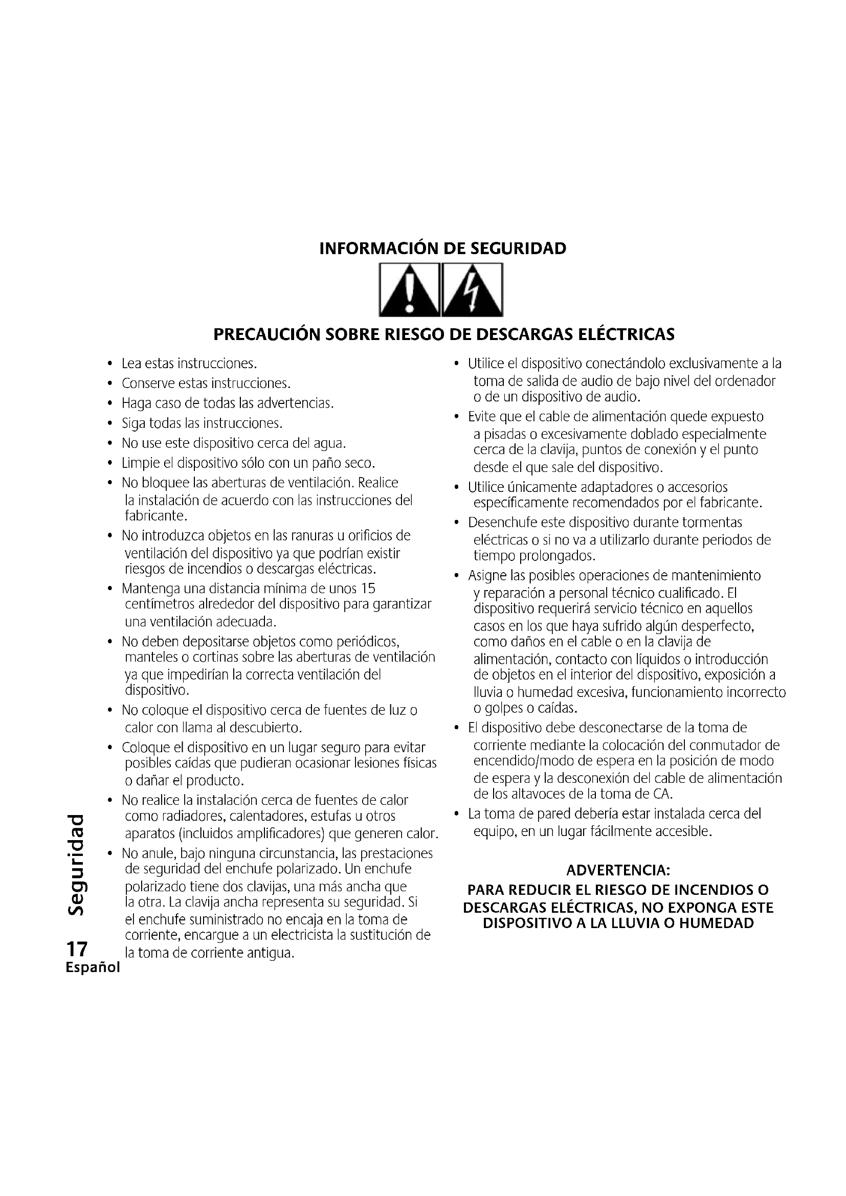 - No introduzca objetos en las ranuras u oricios de ventilación del dispositivo ya que podrían existir riesgos de incendios o descargas eléctricas.