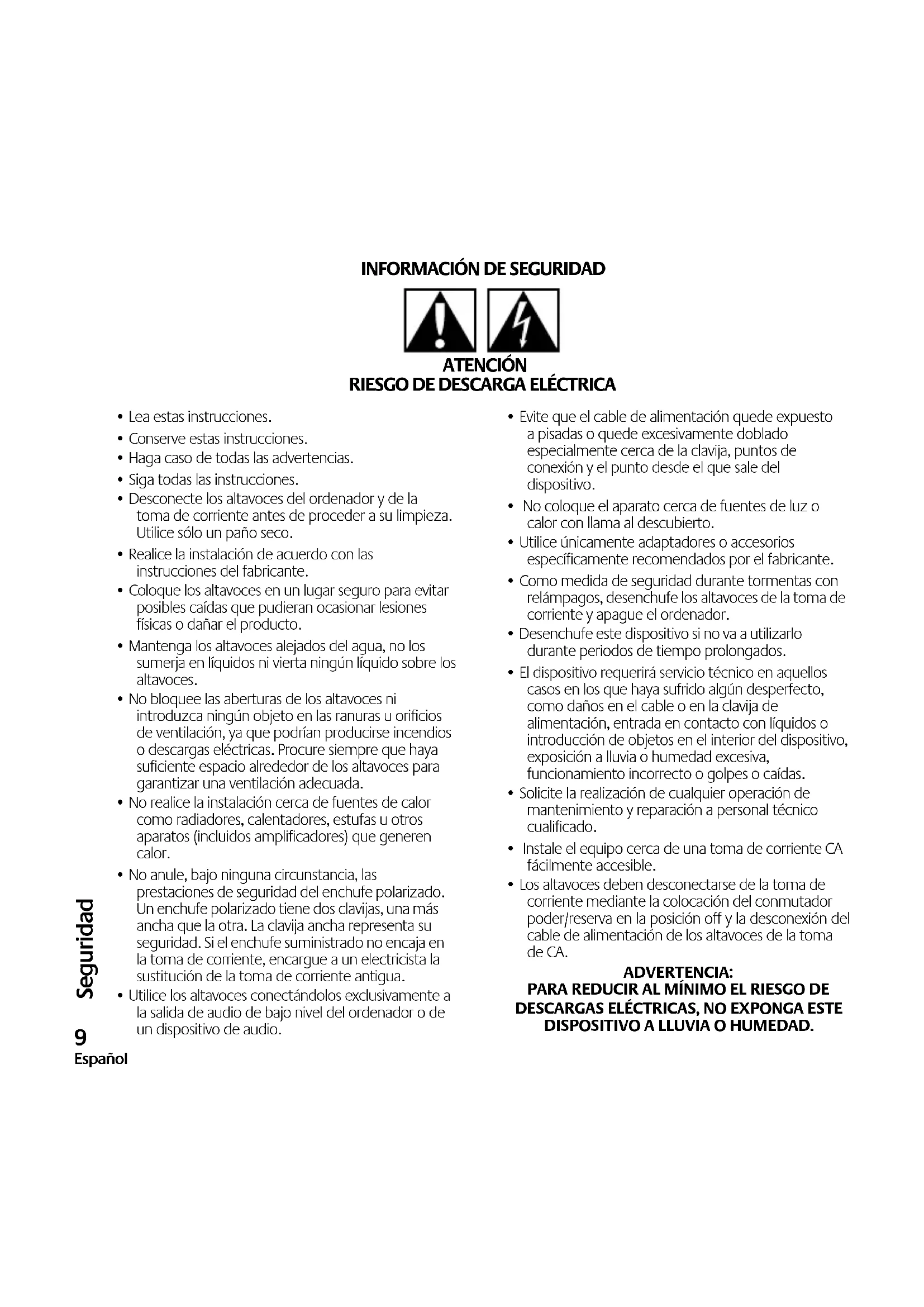 - Desconecte los altavoces del ordenador y de la toma de corriente antes de proceder a su limpieza. Utilice sólo un paño seco.