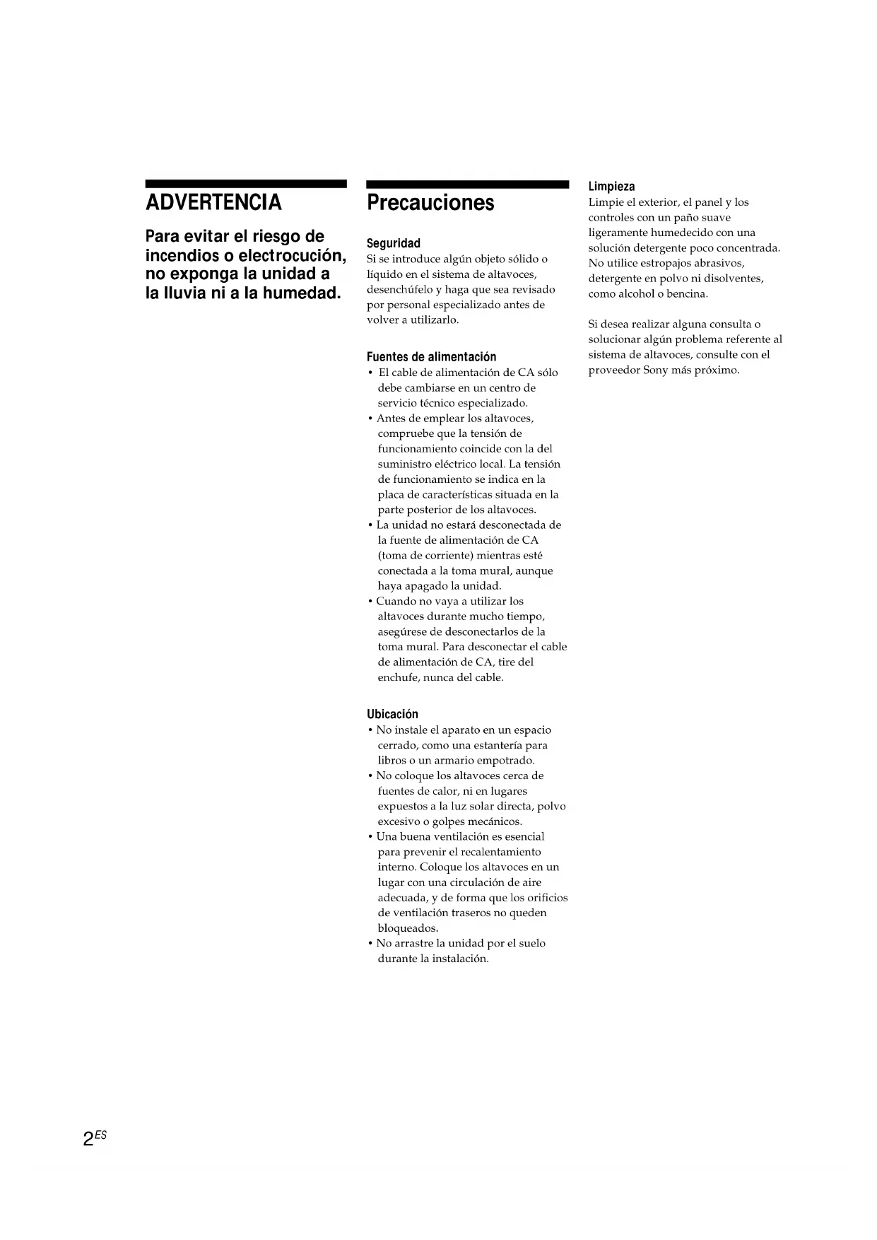 - No instale el aparato en un espaciocerrado, como una estantería paralibros o un armario empotrado.• No coloque los altavoces cerca defuentes de calor, ni en lugaresexpuestos a la luz solar directa, polvoexcesivo o golpes mecánicos.• Una buena ventilación es esencialpara prevenir el recalentamientointerno. Coloque los altavoces en unlugar con una circulación de aireadecuada, y de forma que los orificiosde ventilación traseros no quedenbloqueados.• No arrastre la unidad por el suelodurante la instalación. Limpieza Limpie el exterior, el panel y loscontroles con un paño suaveligeramente humedecido con unasolución detergente poco concentrada.No utilice estropajos abrasivos,detergente en polvo ni disolventes,como alcohol o bencina.Si desea realizar alguna consulta osolucionar algún problema referente alsistema de altavoces, consulte con elproveedor Sony más próximo.3