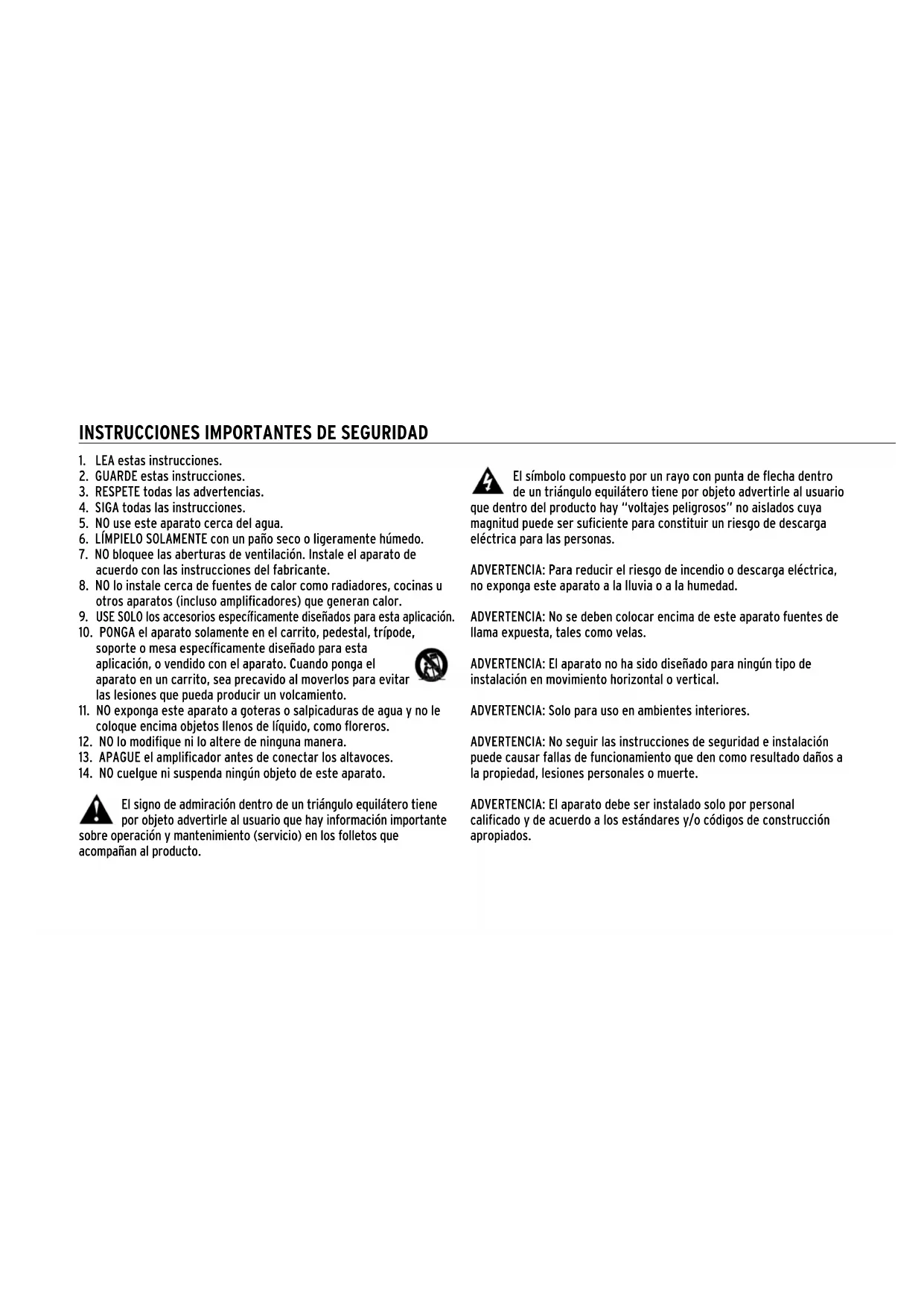 El signo de admiración dentro de un triángulo equilátero tiene por objeto advertirle al usuario que hay información importante sobre operación y mantenimiento (servicio) en los folletos que acompañan al producto. El símbolo compuesto por un rayo con punta de flecha dentro de un triángulo equilátero tiene por objeto advertirle al usuario que dentro del producto hay “voltajes peligrosos” no aislados cuya magnitud puede ser suficiente para constituir un riesgo de descarga eléctrica para las personas. ADVERTENCIA: Para reducir el riesgo de incendio o descarga eléctrica, no exponga este aparato a la lluvia o a la humedad. ADVERTENCIA: No se deben colocar encima de este aparato fuentes de llama expuesta, tales como velas. ADVERTENCIA: El aparato no ha sido diseñado para ningún tipo de instalación en movimiento horizontal o vertical. ADVERTENCIA: Solo para uso en ambientes interiores. ADVERTENCIA: No seguir las instrucciones de seguridad e instalación puede causar fallas de funcionamiento que den como resultado daños a la propiedad, lesiones personales o muerte. ADVERTENCIA: El aparato debe ser instalado solo por personal calificado y de acuerdo a los estándares y/o códigos de construcción apropiados. INSTRUCCIONES IMPORTANTES DE SEGURIDADADVERTENCIA: ¡No abrir! Riesgo de descarga eléctrica. Los voltajes que hay dentro de este equipo son peligrosos para los seres vivos. Dentro del dispositivo no hay piezas que el usuario pueda reparar. Encargue todo servicio al personal de servicio calificado. INFORMACIÓN DE CONFORMIDAD EN LA UNIÓN EUROPEA (EUROPEAN UNION, EU) Tiene derecho a llevar la marca CE. Cumple con las siguientes directivas de la Unión Europea: Compatibilidad Electromagnética (Electromagnetic Compatibility, EMC) 2004/108/EC; Refundición de la Restricción de Sustancias Peligrosas (Restriction of Hazardous Substances Recast, RoHS2) 2011/65/EC; Residuos de Aparatos Eléctricos y Electrónicos, RAEE (Refundición) 2012/19/EC; Bajo Voltaje 2006/95/EC, y Registro, Evaluación, Autorización y Restricción de Sustancias y Preparados Químicos (Registration, Evaluation, Authorization and Restriction of Chemicals, REACH) 2006/121/EC. Se puede obtener una copia gratis de la Declaración de conformidad comunicándose con el minorista, el distribuidor o las oficinas centrales mundiales de Klipsch Group, Inc. La información de contacto se encuentra en http://www.klipsch.com/Contact-Us