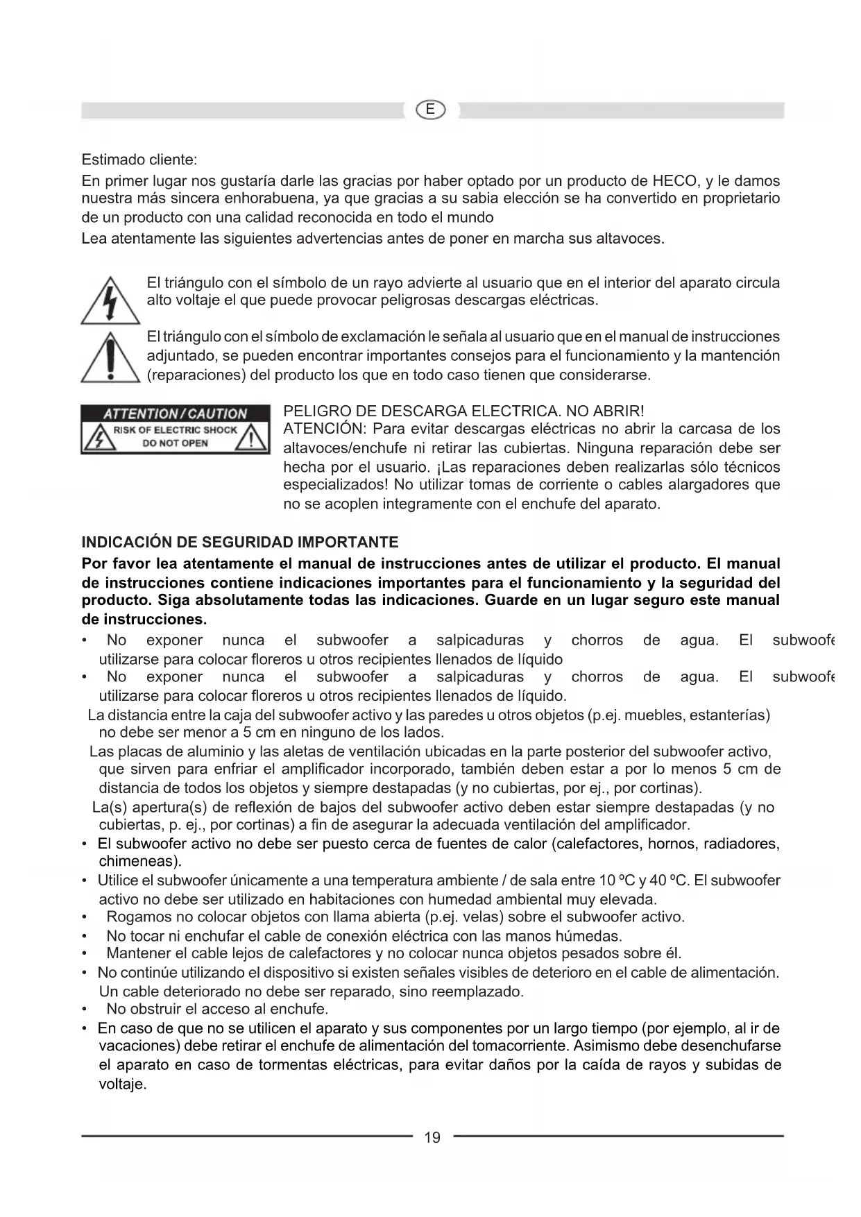 Estimado cliente: En primer lugar nos gustaría darle las gracias por haber optado por un producto de HECO, y le damos nuestra más sincera enhorabuena, ya que gracias a su sabia elección se ha convertido en proprietario de un producto con una calidad reconocida en todo el mundo Lea atentamente las siguientes advertencias antes de poner en marcha sus altavoces. El triángulo con el símbolo de un rayo advierte al usuario que en el interior del aparato circula alto voltaje el que puede provocar peligrosas descargas eléctricas. El triángulo con el símbolo de exclamación le señala al usuario que en el manual de instrucciones adjuntado, se pueden encontrar importantes consejos para el funcionamiento y la mantención (reparaciones) del producto los que en todo caso tienen que considerarse. PELIGRO DE DESCARGA ELECTRICA. NO ABRIR! ATENCIÓN: Para evitar descargas eléctricas no abrir la carcasa de los altavoces/enchufe ni retirar las cubiertas. Ninguna reparación debe ser hecha por el usuario. ¡Las reparaciones deben realizarlas sólo técnicos especializados! No utilizar tomas de corriente o cables alargadores que no se acoplen integramente con el enchufe del aparato.