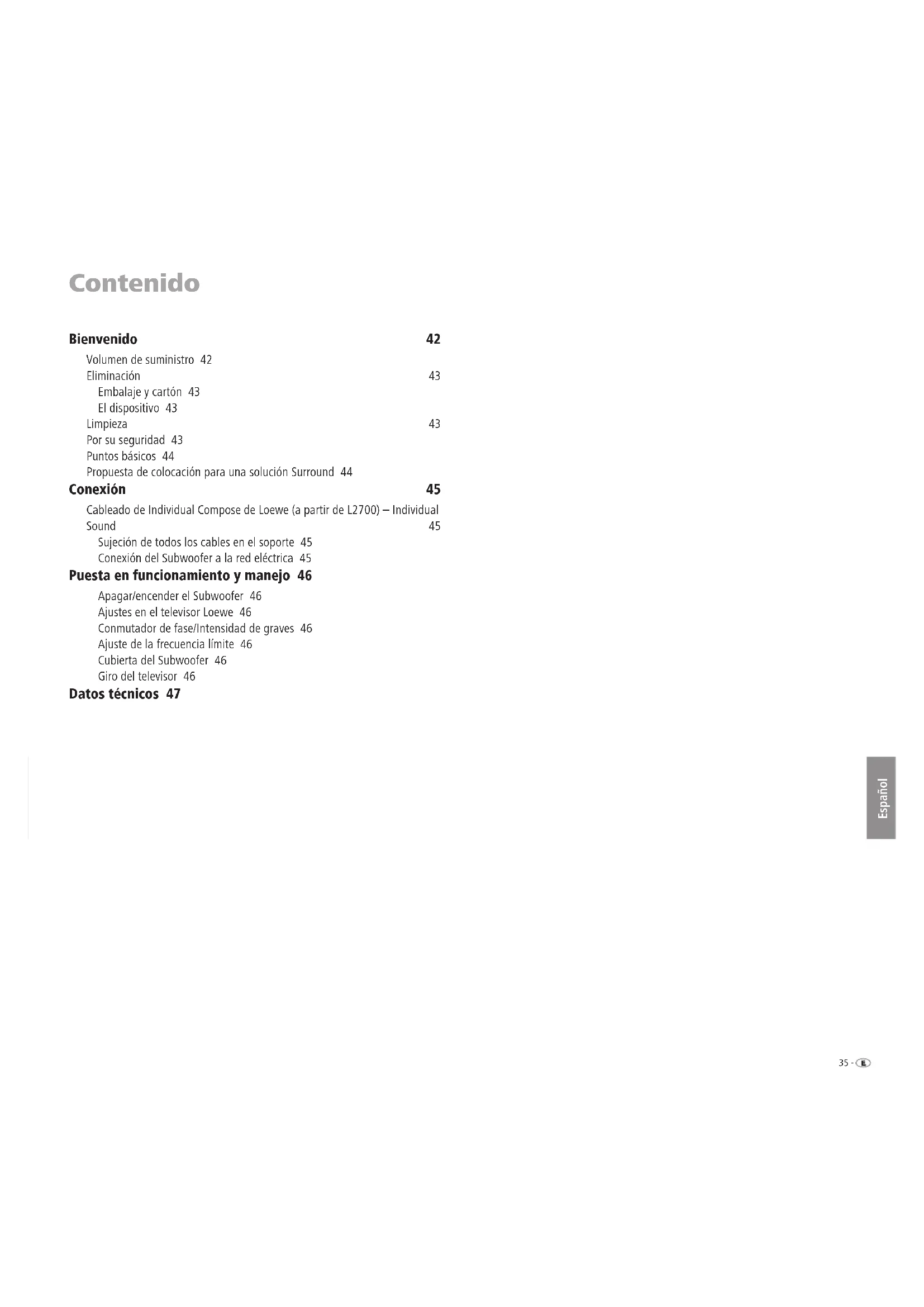 Impostazione della frequenza critica Con il regolatore “Crossover Frequency” avete la possibilità di impostare la frequenza critica per la riproduzione dei bassi a seconda dell’altoparlante che si è collegato tra 50 Hz e 250 Hz. Si raccomanda di impostare il Center Stand su 120Hz. Copertura del subwoofer Dopo avere effettuato le impostazioni indicate in “Messa in funzione e coman- do”, riapplicare la copertura sul retro del subwoofer. Rotazione dell’apparecchio TV L’unità montata di apparecchio TV e TV-Stand può essere ruotata lateralmente di ± 45° a mano.33 - Italiano Dati tecnici Center Floor Stand I Compose Dimensioni in cm Ø 50,2 x H 53,1 Peso in kg 19,5 Principio a 3 vie, disposizione d’Appolito Dotazione N. 1 bassi 80 mm, membrana di carta N. 1 Audio medio altoparlanti 80 mm, membrana di carta N. 1 tono alto, calotta in tessuto rivestito, Ø 33mm Portata 50W (Sinus) / 90W (max. musica) Impedanza 4 - 8 Ohm Banda di trasmissione 120 Hz–22 kHz ± 3dB Pressione acustica 84 dB spl (1w/m) Dichiarazione del costruttore Questo apparecchio è fabbricato nella UE nel rispetto delle disposizioni del D.M. 26 marzo 1992 ed è in particolare conforme alle prescrizioni dell‘art. 1 dello stesso D.M. Questo apparecchio è conforme all‘art. 2 comma 1 D.M. 28.08.95 N. 548. Fabbricatore: Distributore: Made in Germany Loewe Opta GmbH Industriestr. 11 D-96317 Kronach Loewe Italiana SRL Largo del Perlar, 12 I-37135 Verona (VR) CH/07/05/A1© by Loewe Opta 2007- 34 Italiano35 - Español Contenido Bienvenido 42 Volumen de suministro 42 Eliminación 43 Embalaje y cartón 43 El dispositivo 43 Limpieza 43 Por su seguridad 43 Puntos básicos 44 Propuesta de colocación para una solución Surround 44 Conexión 45 Cableado de Individual Compose de Loewe (a partir de L2700) – Individual Sound 45 Sujeción de todos los cables en el soporte 45 Conexión del Subwoofer a la red eléctrica 45 Puesta en funcionamiento y manejo 46 Apagar/encender el Subwoofer 46 Ajustes en el televisor Loewe 46 Conmutador de fase/Intensidad de graves 46 Ajuste de la frecuencia límite 46 Cubierta del Subwoofer 46 Giro del televisor 46 Datos técnicos 47- 36 Español Bienvenido Muchas gracias por haberse decidido por un producto de Loewe. Nos complace mucho contarle entre nuestros clientes. Loewe es un nombre asociado a una exigente calidad en la técnica, el diseño y la facilidad de manejo. Esto se cumple en igual medida en nuestros televisores, equipos de DVD/vídeo/audio y accesorios. Ni la técnica ni el diseño deben ser una meta en sí mismos, sino que les deben proporcionar a nuestros clientes el mayor placer para la vista y el oído. Tampoco en el plano del diseño nos hemos dejado infl uir por tendencias de moda y corta vida pues, a fi n de cuentas, usted ha adquirido un aparato de alta calidad del que podrá disfrutar por mucho tiempo sin aburrirse de él. El sistema de altavoces Individual Sound ha sido especialmente diseñado para su uso con televisores planos de Loewe. El sistema de altavoces puede confi gurarse de forma individual, desde una sim- ple combinación estéreo hasta una sofi sticada solución con cuatro altavoces de pie, pasando por una variante de cuatro altavoces satélites y un altavoz central. En cada caso, también se incluye un Subwoofer con amplifi cador integrado. De esta forma, podrá reproducir los DVD con la calidad de cine de Dolby Digital. También podrá convertir emisiones o reproducciones estéreo (del vídeo o un reproductor de DVD) en Dolby ProLogic o bien Virtual o Circle Surround en casi una señal Surround 5.1 y reproducirlas con el sistema de altavoces Individual Sound. Si su televisor (a partir de chasis L2700) está equipado con un sintoni- zador digital (DVB), la señal Surround digital que se reciba será descodifi cada y reproducida a través del equipo Individual Sound. El equipo de altavoces Individual Sound se enciende y apaga automáticamente con el televisor plano de Loewe. Realice los ajustes para Dolby Digital cómodamente a través de los menús del televisor plano de Loewe. Volumen de suministro Center Floor Stand I Compose, nº de pedido 67207B/L00 Center Floor Stand I Compose Cable para los altavoces (6 m) Tubo de tela Soportes para el tubo de tela Manual de instrucciones Instrucciones de montaje