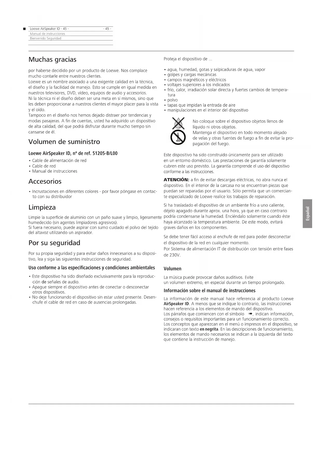 - 45 -Manual de instruccionesBienvenido Seguridad Muchas gracias por haberse decidido por un producto de Loewe. Nos complace mucho contarle entre nuestros clientes. Loewe es un nombre asociado a una exigente calidad en la técnica, el diseño y la facilidad de manejo. Esto se cumple en igual medida en nuestros televisores, DVD, vídeo, equipos de audio y accesorios. Ni la técnica ni el diseño deben ser una meta en sí mismos, sino que les deben proporcionar a nuestros clientes el mayor placer para la vista y el oído. Tampoco en el diseño nos hemos dejado distraer por tendencias y modas pasajeras. A n de cuentas, usted ha adquirido un dispositivo de alta calidad, del que podrá disfrutar durante mucho tiempo sin cansarse de él. Volumen de suministro Loewe AirSpeaker ID, nº de ref. 51205-B/L00