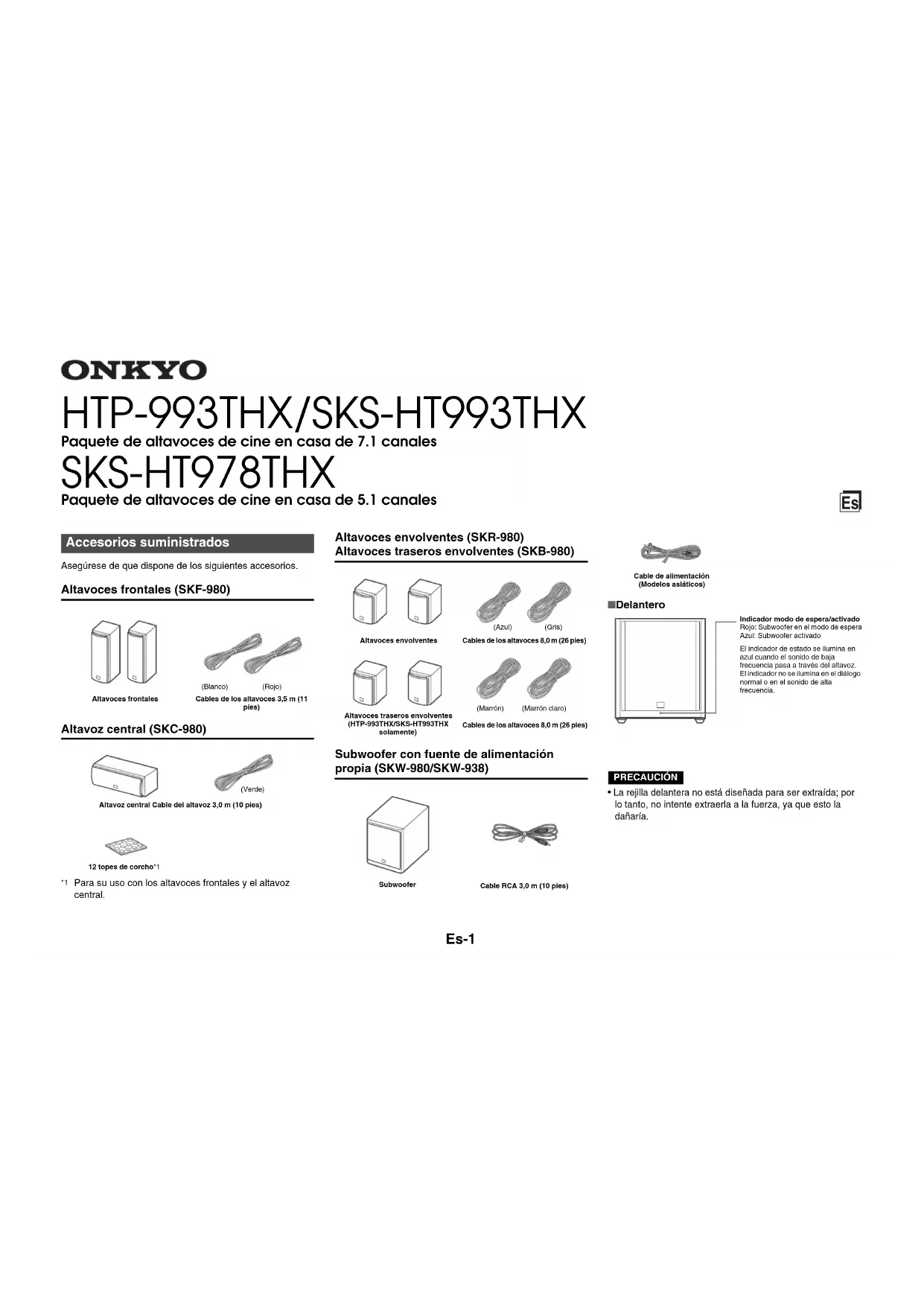 - La rejilla delantera no está diseñada para ser extraída; por lo tanto, no intente extraerla a la fuerza, ya que esto la dañaría. Accesorios suministrados Altavoces frontalesCables de los altavoces 3,5 m (11 pies)Altavoz central Cable del altavoz 3,0 m (10 pies)12 topes de corcho*1(Blanco)(Rojo)(Verde)Altavoces envolventesAltavoces traseros envolventes(HTP-993THX/SKS-HT993THX solamente)Cables de los altavoces 8,0 m (26 pies)SubwooferCable RCA 3,0 m (10 pies)(Azul)(Gris)(Marrón)(Marrón claro)Cables de los altavoces 8,0 m (26 pies) Cable de alimentación(Modelos asiáticos) Indicador modo de espera/activadoRojo: Subwoofer en el modo de esperaAzul: Subwoofer activadoEl indicador de estado se ilumina en azul cuando el sonido de baja frecuencia pasa a través del altavoz.El indicador no se ilumina en el diálogo normal o en el sonido de alta frecuencia.