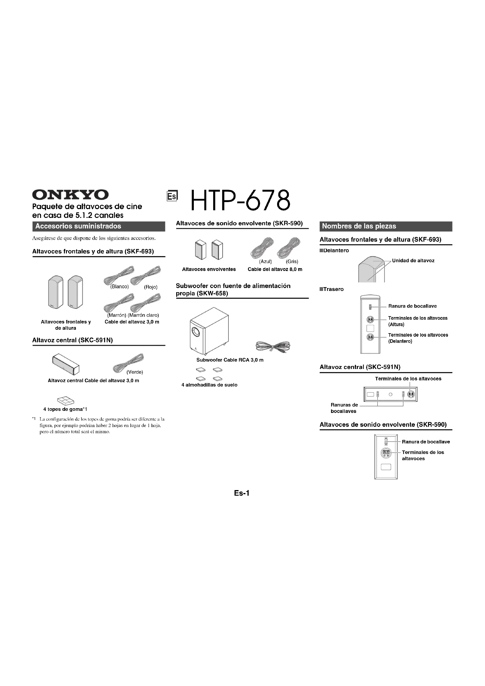 Paquete de altavoces de cine en casa de 5.1.2 canales Asegúrese de que dispone de los siguientes accesorios.Altavoces frontales y de altura (SKF-693)Altavoz central (SKC-591N) La configuración de los topes de goma podría ser diferente a la figura, por ejemplo podrían haber 2 hojas en lugar de 1 hoja, pero el número total será el mismo.Altavoces de sonido envolvente (SKR-590)Subwoofer con fuente de alimentación propia (SKW-658)Altavoces frontales y de altura (SKF-693)Altavoz central (SKC-591N)Altavoces de sonido envolvente (SKR-590) Accesorios suministrados Altavoces frontales y de alturaCable del altavoz 3,0 m Altavoz central Cable del altavoz 3,0 m4 topes de goma*1 (Blanco)(Rojo) (Marrón) (Marrón claro) (Verde) Subwoofer Cable RCA 3,0 m4 almohadillas de suelo (Azul)(Gris) Nombres de las piezas Terminales de los altavoces(Altura)Ranura de bocallaveTerminales de los altavoces(Delantero)■ Trasero■ DelanteroUnidad de altavoz Terminales de los altavocesRanuras de bocallaves Terminales de los altavocesRanura de bocallave HTP-678 Cable del altavoz 8,0 mAltavoces envolventesEs-2 Atención
