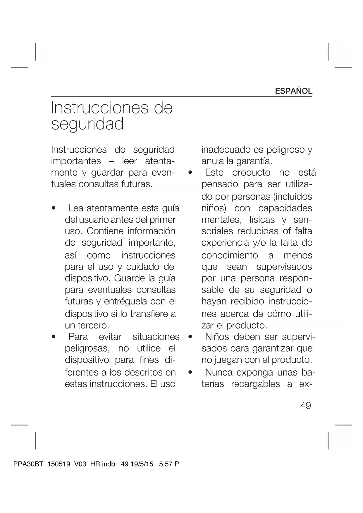 El producto solo está previsto para la reproducción de soni- do y la recepción de llamadas de teléfono a través de Blue- tooth. Utilice el producto úni- camente como se describe en este manual. Uso previsto IM_PPA30BT_150519_V03_HR.indb 53 19/5/15 5:57 PMESPAÑOL