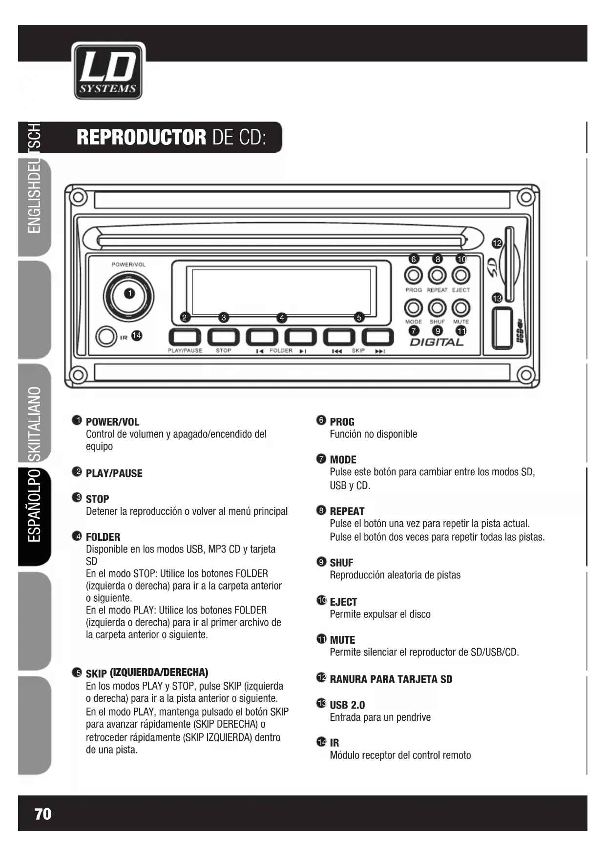 BOTÓN SEL: Pulse este botón para cambiar entre los modos SD, USB y CD.