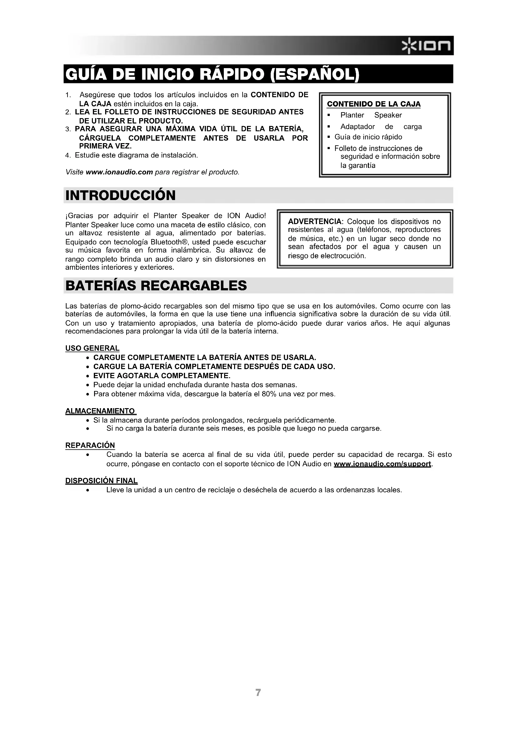 Planter Speaker Adaptador de carga Guía de inicio rápido Folleto de instrucciones de seguridad e información sobre la garantía ADVERTENCIA: Coloque los dispositivos no resistentes al agua (teléfonos, reproductores de música, etc.) en un lugar seco donde no sean afectados por el agua y causen un riesgo de electrocución.8