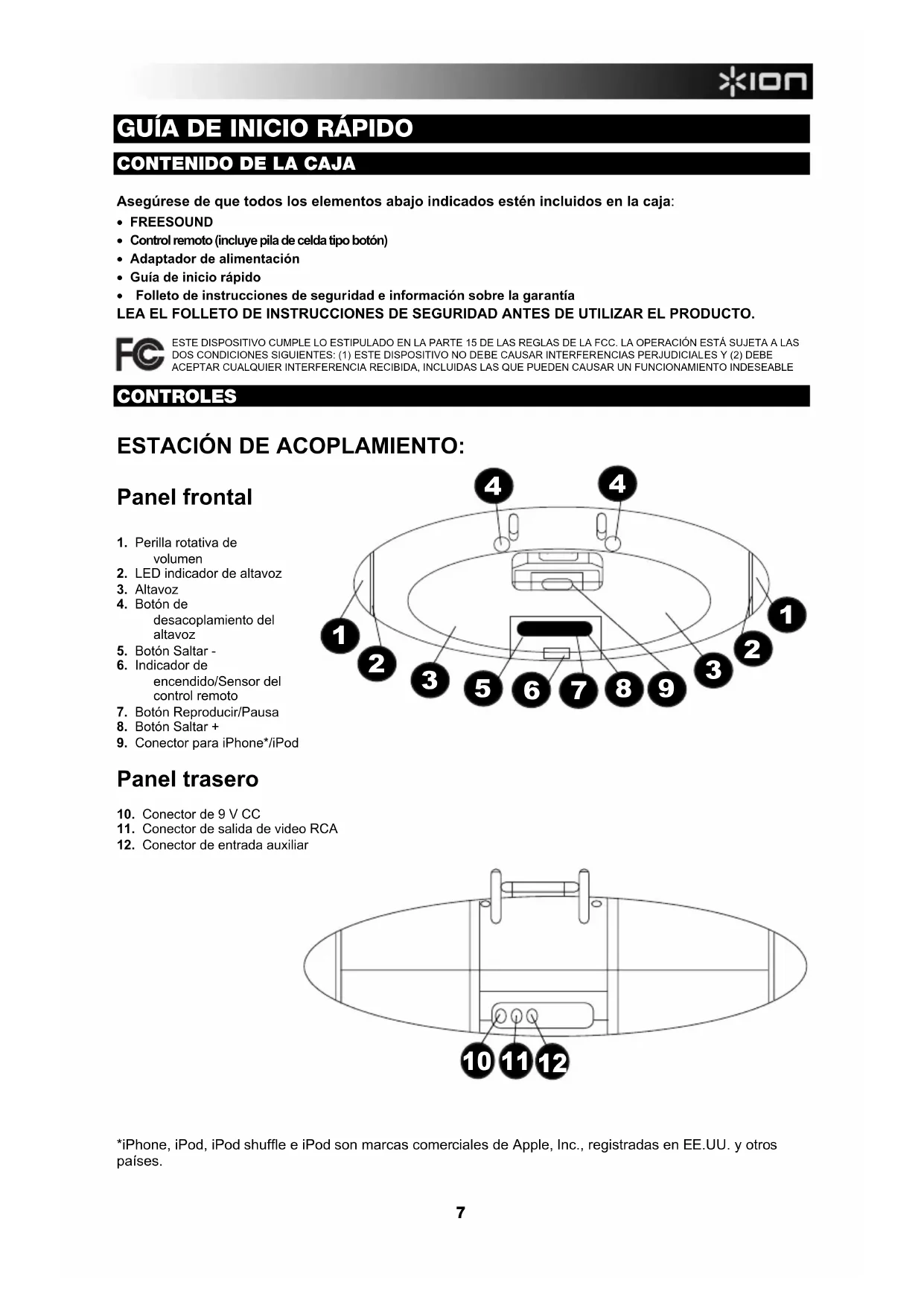 - Folleto de instrucciones de seguridad e información sobre la garantía LEA EL FOLLETO DE INSTRUCCIONES DE SEGURIDAD ANTES DE UTILIZAR EL PRODUCTO. CONTROLES ESTACIÓN DE ACOPLAMIENTO: Panel frontal 1. Perilla rotativa de volumen 2. LED indicador de altavoz 3. Altavoz 4. Botón de desacoplamiento del altavoz 5. Botón Saltar - 6. Indicador de encendido/Sensor del control remoto 7. Botón Reproducir/Pausa 8. Botón Saltar + 9. Conector para iPhone*/iPod Panel trasero