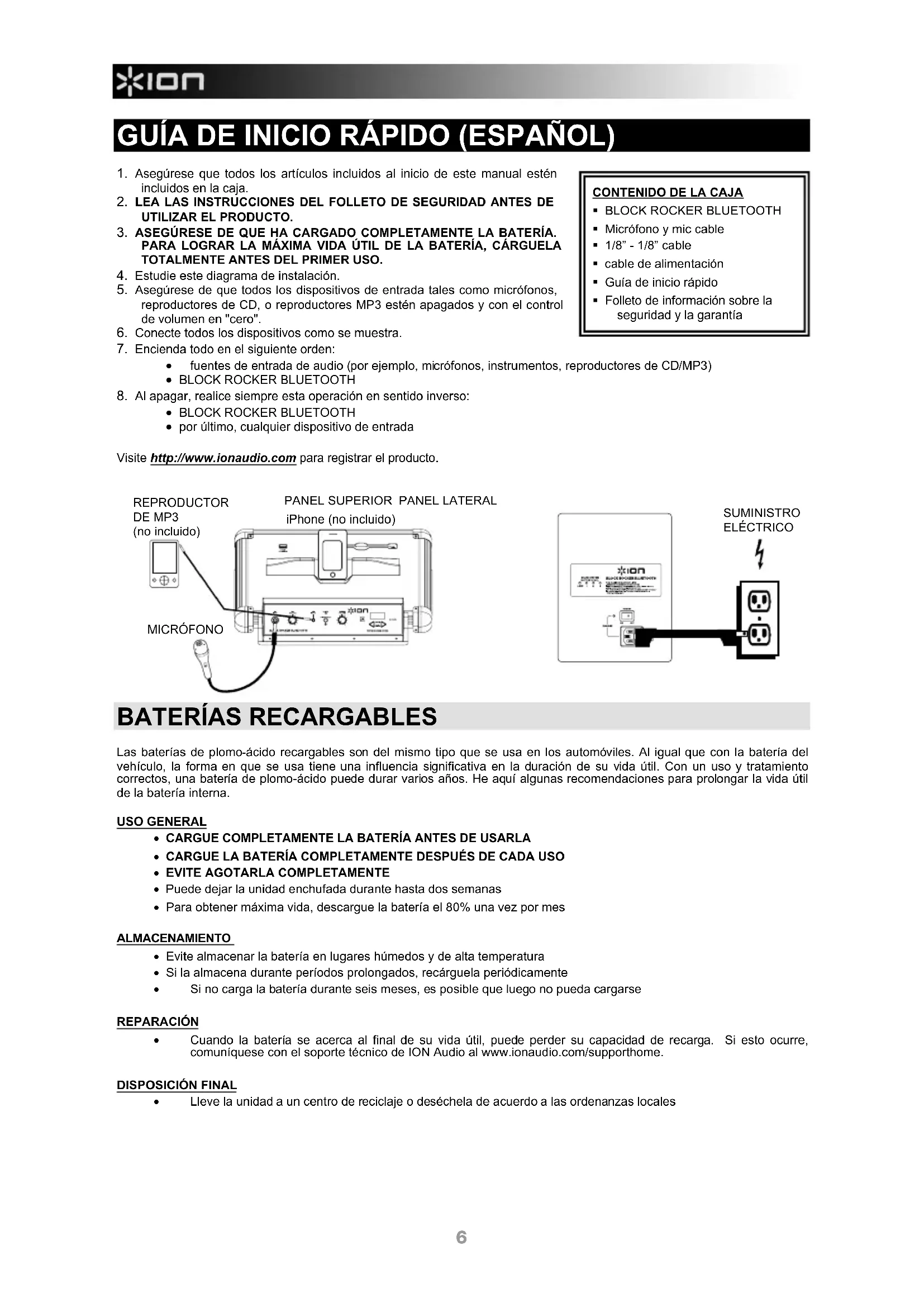 Visite http://www.ionaudio.com para registrar el producto. CONTENIDO DE LA CAJA BLOCK ROCKER BLUETOOTH Micrófono y mic cable 1/8” - 1/8” cable cable de alimentación Guía de inicio rápido Folleto de información sobre la seguridad y la garantía PANEL SUPERIOR PANEL LATERAL MICRÓFONO iPhone (no incluido)SUMINISTRO ELÉCTRICO REPRODUCTOR DE MP3 (no incluido)7