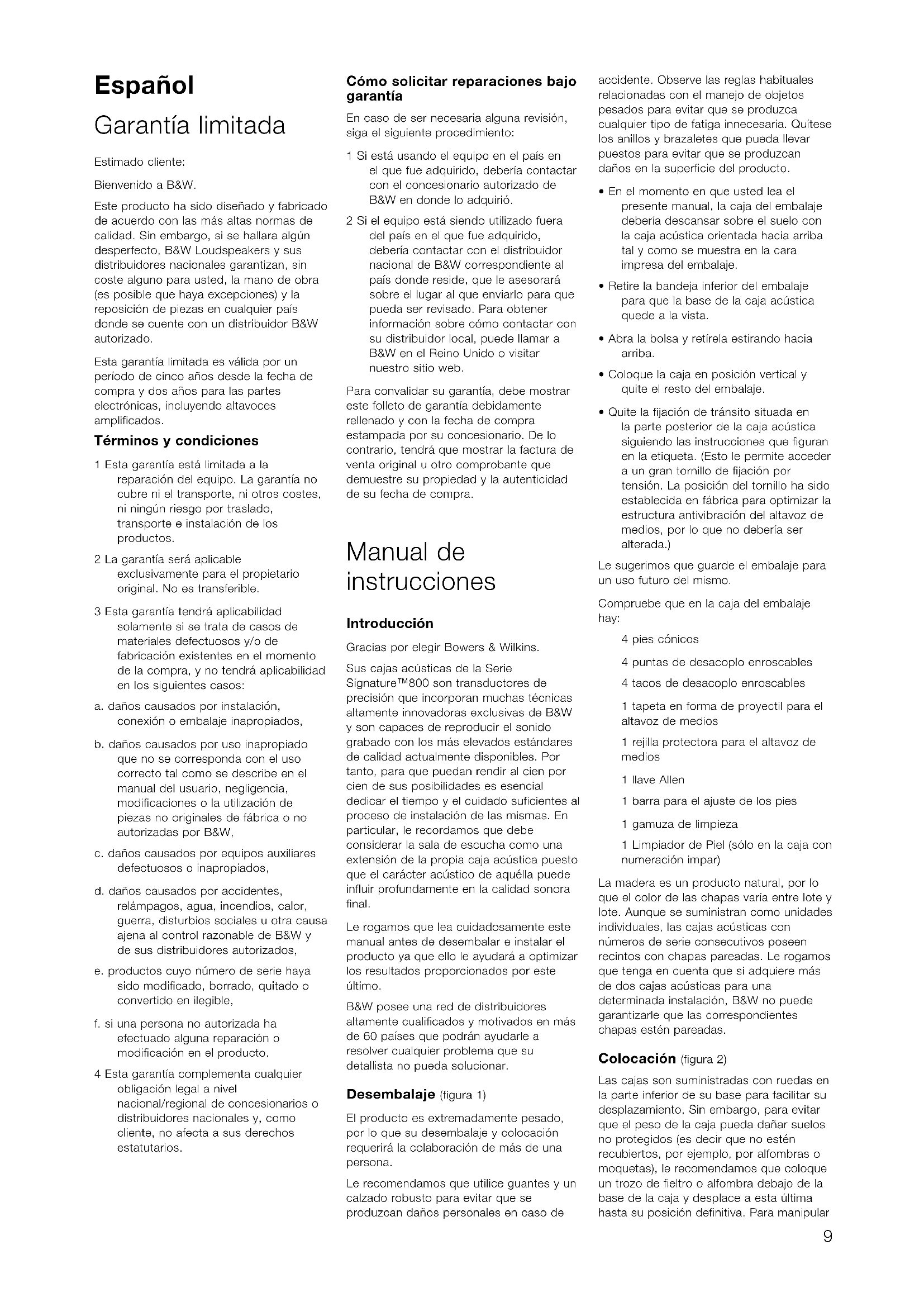 Reinigungsmittels mit einem frischen, mit klarem Wasser angefeuchteten Tuch. Vermeiden Sie es, die Lautsprecherchassis zu berühren, da dies zu Beschädigungen führen kann. Das gilt vor allem für den Hochtöner. 8Español Garantía limitada Estimado cliente: Bienvenido a B&W. Este producto ha sido diseñado y fabricado de acuerdo con las más altas normas de calidad. Sin embargo, si se hallara algún desperfecto, B&W Loudspeakers y sus distribuidores nacionales garantizan, sin coste alguno para usted, la mano de obra (es posible que haya excepciones) y la reposición de piezas en cualquier país donde se cuente con un distribuidor B&W autorizado. Esta garantía limitada es válida por un período de cinco años desde la fecha de compra y dos años para las partes electrónicas, incluyendo altavoces amplificados. Términos y condiciones 1 Esta garantía está limitada a la reparación del equipo. La garantía no cubre ni el transporte, ni otros costes, ni ningún riesgo por traslado, transporte e instalación de los productos. 2 La garantía será aplicable exclusivamente para el propietario original. No es transferible. 3 Esta garantía tendrá aplicabilidad solamente si se trata de casos de materiales defectuosos y/o de fabricación existentes en el momento de la compra, y no tendrá aplicabilidad en los siguientes casos: a. daños causados por instalación, conexión o embalaje inapropiados, b. daños causados por uso inapropiado que no se corresponda con el uso correcto tal como se describe en el manual del usuario, negligencia, modificaciones o la utilización de piezas no originales de fábrica o no autorizadas por B&W, c. daños causados por equipos auxiliares defectuosos o inapropiados, d. daños causados por accidentes, relámpagos, agua, incendios, calor, guerra, disturbios sociales u otra causa ajena al control razonable de B&W y de sus distribuidores autorizados, e. productos cuyo número de serie haya sido modificado, borrado, quitado o convertido en ilegible, f. si una persona no autorizada ha efectuado alguna reparación o modificación en el producto. 4 Esta garantía complementa cualquier obligación legal a nivel nacional/regional de concesionarios o distribuidores nacionales y, como cliente, no afecta a sus derechos estatutarios. Cómo solicitar reparaciones bajo garantía En caso de ser necesaria alguna revisión, siga el siguiente procedimiento: 1 Si está usando el equipo en el país en el que fue adquirido, debería contactar con el concesionario autorizado de B&W en donde lo adquirió. 2 Si el equipo está siendo utilizado fuera del país en el que fue adquirido, debería contactar con el distribuidor nacional de B&W correspondiente al país donde reside, que le asesorará sobre el lugar al que enviarlo para que pueda ser revisado. Para obtener información sobre cómo contactar con su distribuidor local, puede llamar a B&W en el Reino Unido o visitar nuestro sitio web. Para convalidar su garantía, debe mostrar este folleto de garantía debidamente rellenado y con la fecha de compra estampada por su concesionario. De lo contrario, tendrá que mostrar la factura de venta original u otro comprobante que demuestre su propiedad y la autenticidad de su fecha de compra. Manual de instrucciones Introducción Gracias por elegir Bowers & Wilkins. Sus cajas acústicas de la Serie Signature™800 son transductores de precisión que incorporan muchas técnicas altamente innovadoras exclusivas de B&W y son capaces de reproducir el sonido grabado con los más elevados estándares de calidad actualmente disponibles. Por tanto, para que puedan rendir al cien por cien de sus posibilidades es esencial dedicar el tiempo y el cuidado suficientes al proceso de instalación de las mismas. En particular, le recordamos que debe considerar la sala de escucha como una extensión de la propia caja acústica puesto que el carácter acústico de aquélla puede influir profundamente en la calidad sonora final. Le rogamos que lea cuidadosamente este manual antes de desembalar e instalar el producto ya que ello le ayudará a optimizar los resultados proporcionados por este último. B&W posee una red de distribuidores altamente cualificados y motivados en más de 60 países que podrán ayudarle a resolver cualquier problema que su detallista no pueda solucionar. Desembalaje (figura 1) El producto es extremadamente pesado, por lo que su desembalaje y colocación requerirá la colaboración de más de una persona. Le recomendamos que utilice guantes y un calzado robusto para evitar que se produzcan daños personales en caso de accidente. Observe las reglas habituales relacionadas con el manejo de objetos pesados para evitar que se produzca cualquier tipo de fatiga innecesaria. Quítese los anillos y brazaletes que pueda llevar puestos para evitar que se produzcan daños en la superficie del producto.
